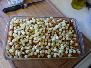 If you want to make your own sauce and your own croutons, by all means do so. Tonight I used what I had on hand. It was quick and easy. The croutons worked very well to absorb the water created by the cooking zucchini.