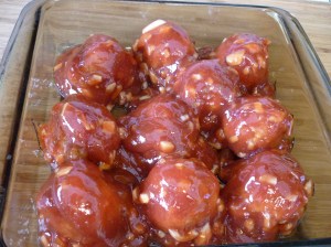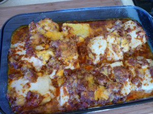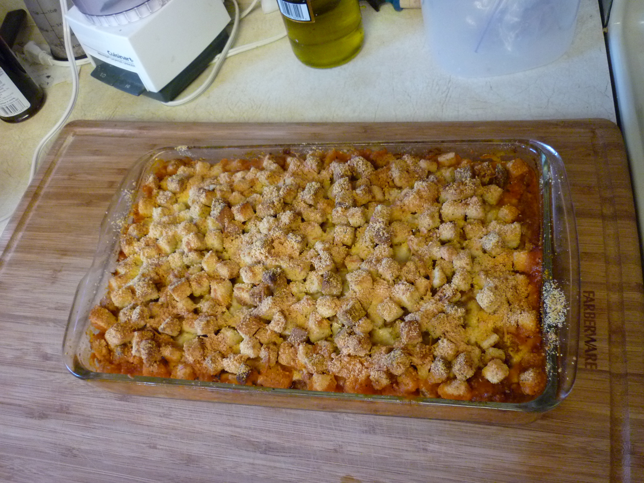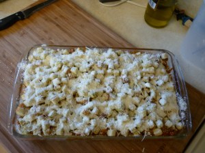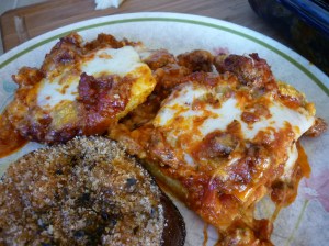 To assemble the dish, lay out the zucchini shells in a greased 11×7″ pan. Cut the mozzarella into pieces and lay the pieces into the zucchini shells. Cover everything with sauce. Sprinkle croutons across the top. Sprinkle Parmesan cheese over all. Bake uncovered at 350 degrees for 45-60 minutes. Place a foil tent lightly over the top at about 45 minutes if it starts getting too brown. Remove from heat when you see it bubbling. Let sit for 5-10 minutes.