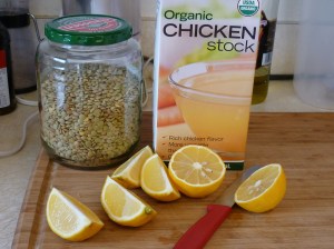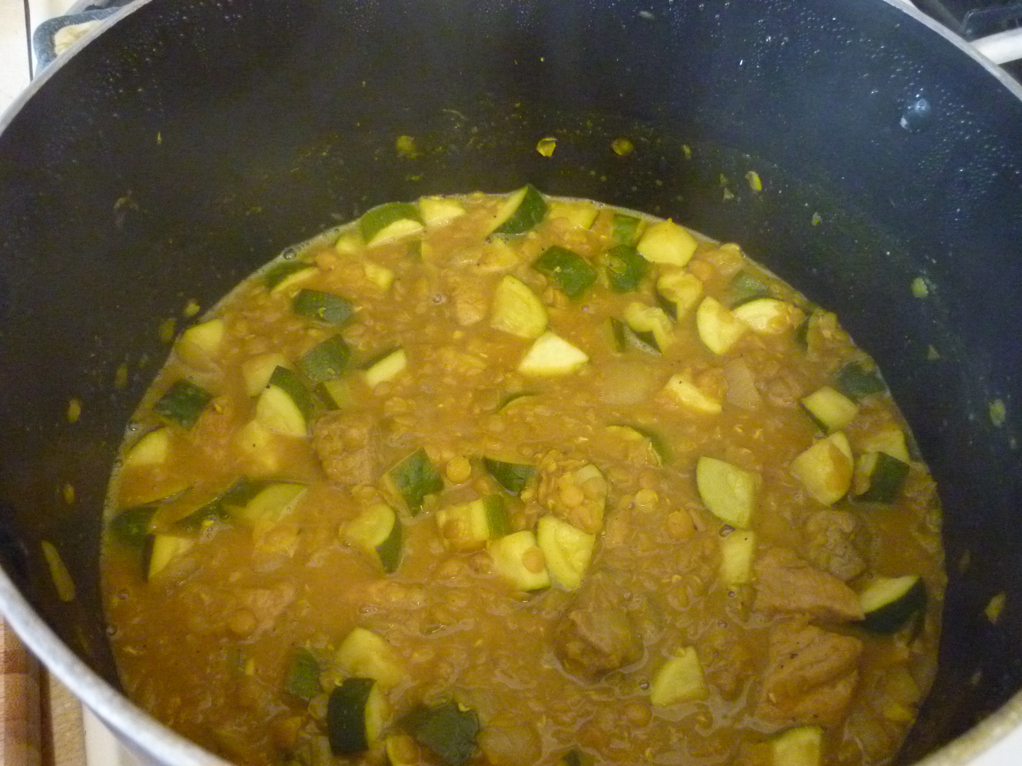 Return the onion mixture to the pot and pour in the chicken broth. Juice one of the lemons and add the juice. Cut the other lemon into quarters and add them. Stir in the lentils. Cover and let simmer for 35-60 minutes, depending upon how old your lentils are and how mushy you like them. Add zucchini and simmer until they’re cooked. Season with salt and pepper.
