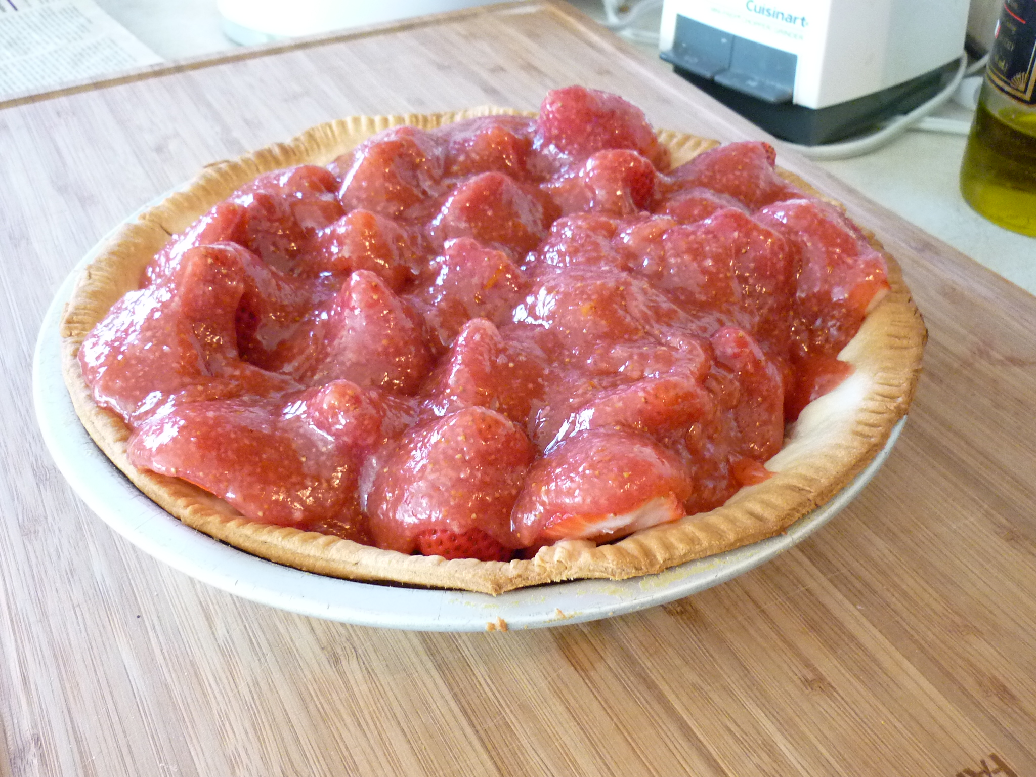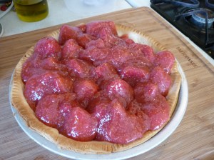 First, I must give credit to Sunset Magazine for this recipe. It was in their June 1990 issue in an article called Summer Fruit Pies, chock-full of pie recipes. It’s like my pie-recipe Bible. There are so many pieces of scotch tape holding that issue together, it’s incredible. This strawberry pie is my favorite. I like it because you make the glaze yourself from whole strawberries. There aren’t any artificial dyes or gelatin in it. My big pie confession is that I can’t make a pie crust to save my life. Every few years I try, but without success. I buy the crusts found in the refrigerated section of the grocery, the kind you unroll. Today is March 17, 2012, St. Patrick’s Day, one of my favorite food holidays. I’ve got corned beef boiling on the stove top and Irish soda bread planned. The strawberry pie is the pièce de résistance of the meal.
