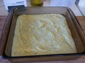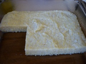 Bring water to a rolling boil and very slowly sprinkle polenta into the water while stirring all the while. Reduce the heat once it comes back to a boil. Continue stirring while the polenta simmers. As it thickens it begins to splatter. Once it’s fairly thick, it’s okay to leave it for a couple minutes at a time, so stir frequently instead of constantly. A spatter guard is a huge help. The process of simmering and stirring takes about 25 minutes. The polenta should be quite thick. Coat a 8×8″ square pan with olive oil and pour the polenta into it. Smooth out the top with a spatula as best you can. Once it’s cooled a little, place it into the refrigerator for an hour or longer.