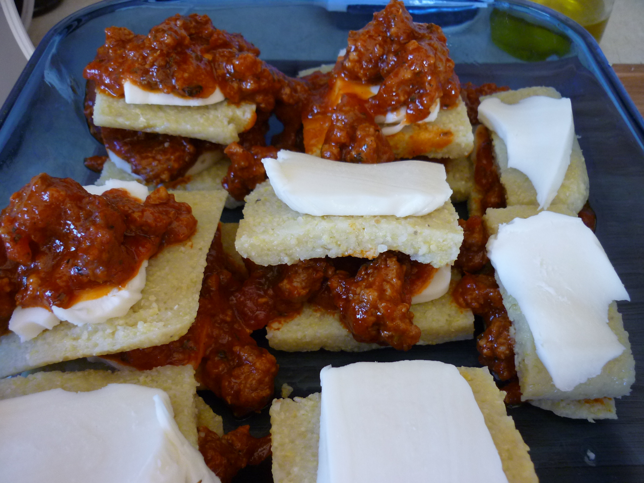 Cut the 8×8″ pan of polenta into 9 squares. Lift out each square, turn it so you see the short side, and slice in half. Now you have eighteen slices, roughly the same size. Lay nine of the squares out on a baking dish (a 9×13″ will work, but another size might work better-see below) which has been coated with olive oil. Top each polenta square with a piece mozzarella, then sauce. Then top the sauce with another slice of polenta, cheese, and sauce. Sprinkle the whole thing with Parmesan cheese. Bake at 350 degrees for about 45 minutes.