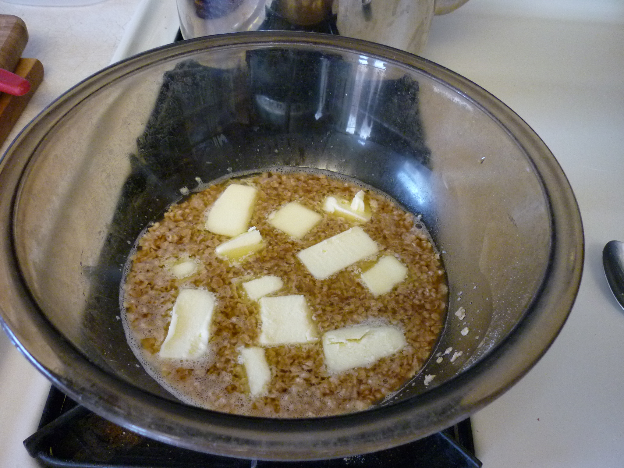 Mix together quick-oats, brown sugar, and boiling water. Place butter slices on top. Let stand for 10 minutes.