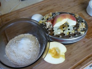 In a small bowl, beat the egg lightly. Stir beaten egg into the oat mixture and stir until well combined and butter is fully melted. Stir the dry ingredients into the wet and mix well. Stir in the apple and lingonberries.