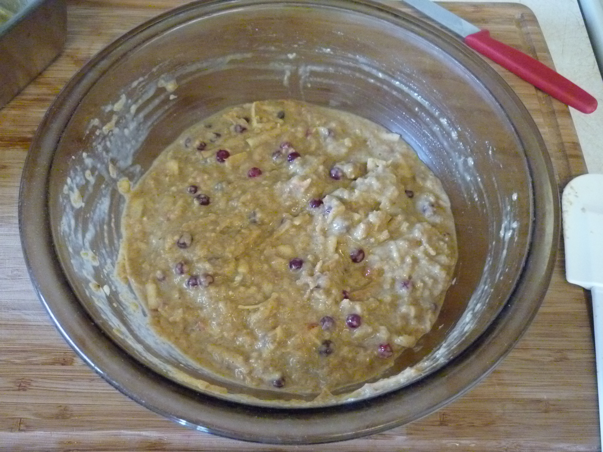 Mix in beaten egg. Stir in dry ingredients. Stir in apple and cranberries.
