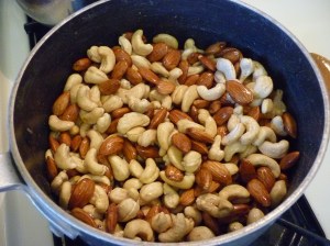 Stir in 3 cups raw whole cashews and 3 cups raw whole almonds. Let simmer one minute.