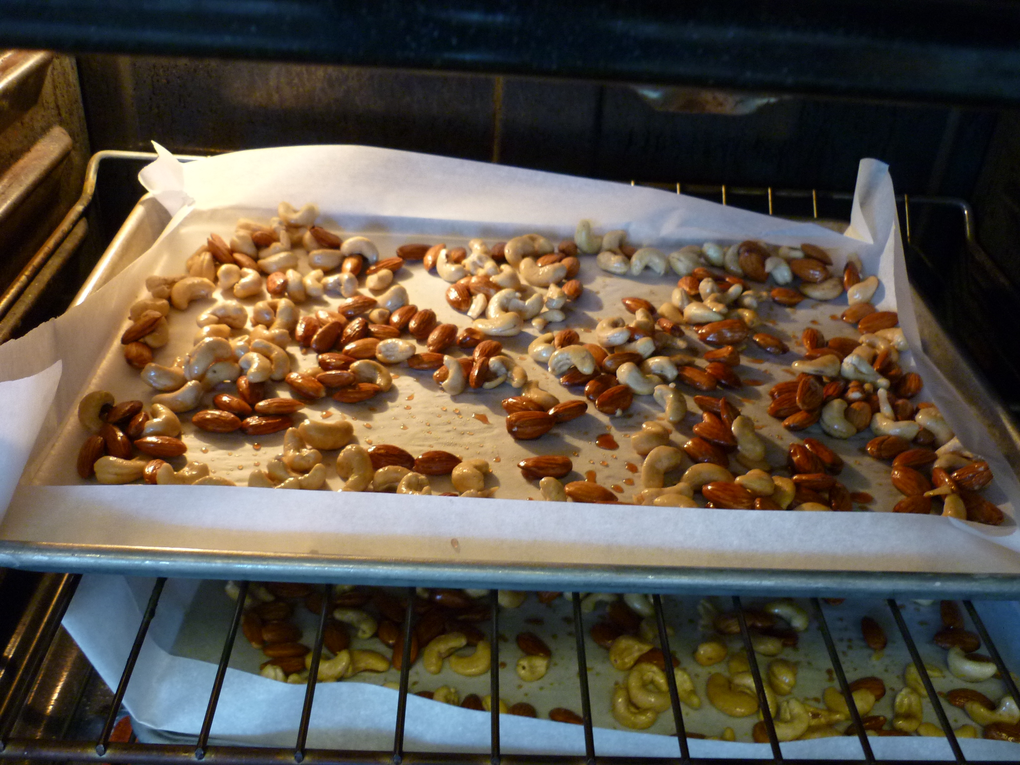 Bake for 15 minutes. Remove from oven and stir around. You’ll need to hold the parchment paper between your fingers so that it doesn’t slide off the pan onto the floor while you’re stirring. The pan is hot, of course, but the paper you should be able to grip. Put the pans back in the oven for another five minutes or so. Keep a good eye on it and remove when the nuts turn golden.
