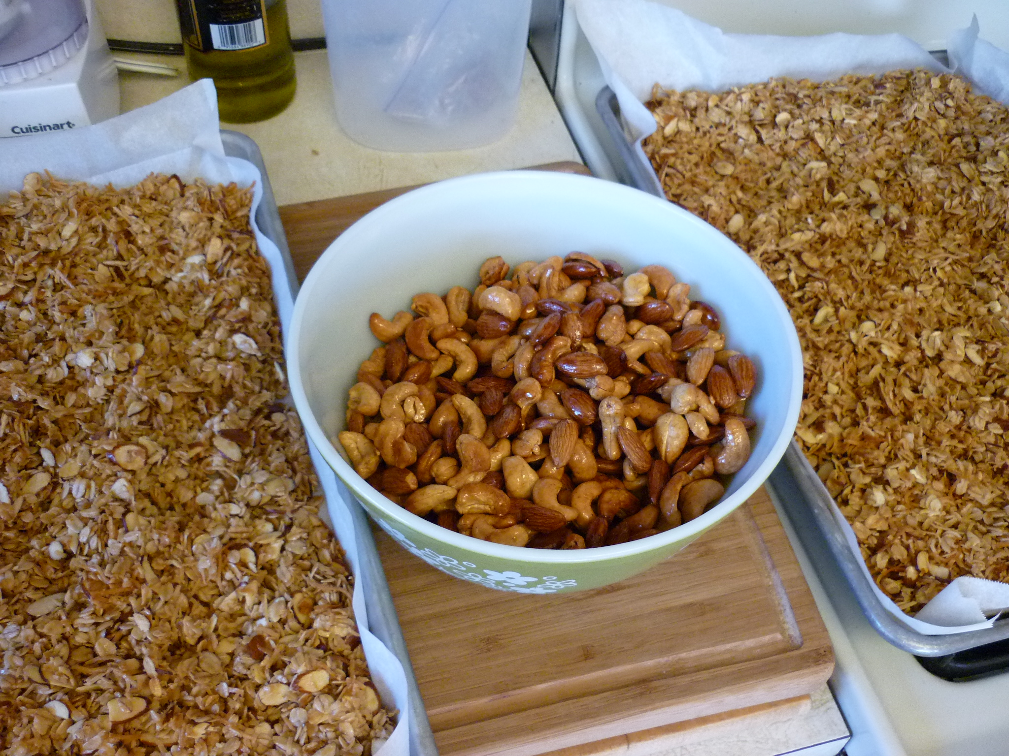 At my house granola has been a work in progress. The whole family really likes granola. It’s easy to make. The availability of parchment paper has made it easier still. Most of the ingredients I purchase in bulk at the natural foods section of the grocery store. I’ve spent the last couple years experimenting with various recipes. I used one recipe consistently that called for honey and had little oil. It seemed more healthy. Then last summer my friend Kate gave me a recipe that was like candy and I was cured of trying to be healthy. The granola was a little unwieldy because it stuck together in a glob. This did not detract from the taste whatsoever and no one cares how much trouble it is if they’re not the ones making it. The real problem with granola is that my family members eat it so quickly that I have to make it a couple times a week and it becomes a chore. And that’s using double batches. Sigh.