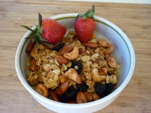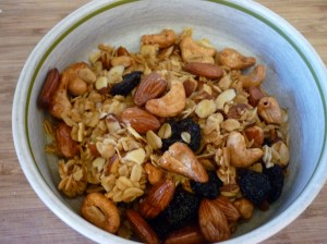 Once cool, break up the granola a little and mix with the candied nuts. Add a couple cups of dried fruit, like cherries or cranberries. Tastes great with yogurt or milk or ice cream.