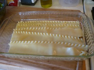 Cook eleven lasagna noodles (about 1/2 lb.) according to the package directions for al dente. Do NOT overcook. Drain. Rinse with cold water to stop the cooking process. Drain. Set aside.