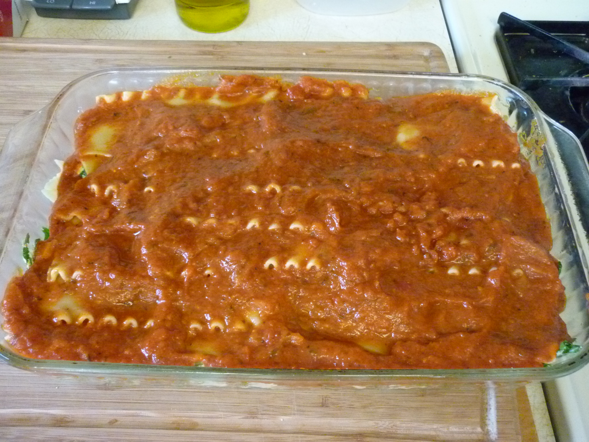 This recipe is based upon a stuffed manicotti recipe in Sunset Magazine’s December 1991 issue. I’ve made the stuffed manicotti many times, but it’s time consuming. I was looking for something more simple using the feta I love. This lasagna turned out surprisingly well. It’s a hit! Take note that I eyeballed every bit of this, I didn’t measure anything. Feel free to do the same. One thing that I tried to keep in mind was that I didn’t want runny lasagna, so I was careful about the amount of liquid used. Another thing to keep in mind is that the spinach cooks down so the dish is a little more compact than the thick slices of hearty lasagna I usually make.
