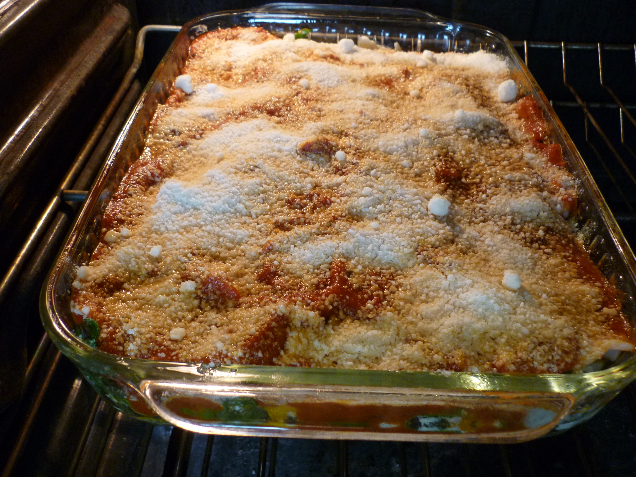 In a greased 9 x 13″ pan, place 5 lasagna noodles across the bottom. Distribute all the cheese, spinach, onion mixture across the lasagna noodles. Place a layer of six noodles across the cheese mixture. You may press down a little now. Spoon pasta sauce evenly across the top. Sprinkle with Parmesan cheese. Bake at 350 degrees for 40 minutes. Yummy goodness!