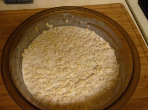 The next morning beat 2 eggs and melt 4 Tbsp (1/2 stick) butter. Stir into oat mixture just until blended.