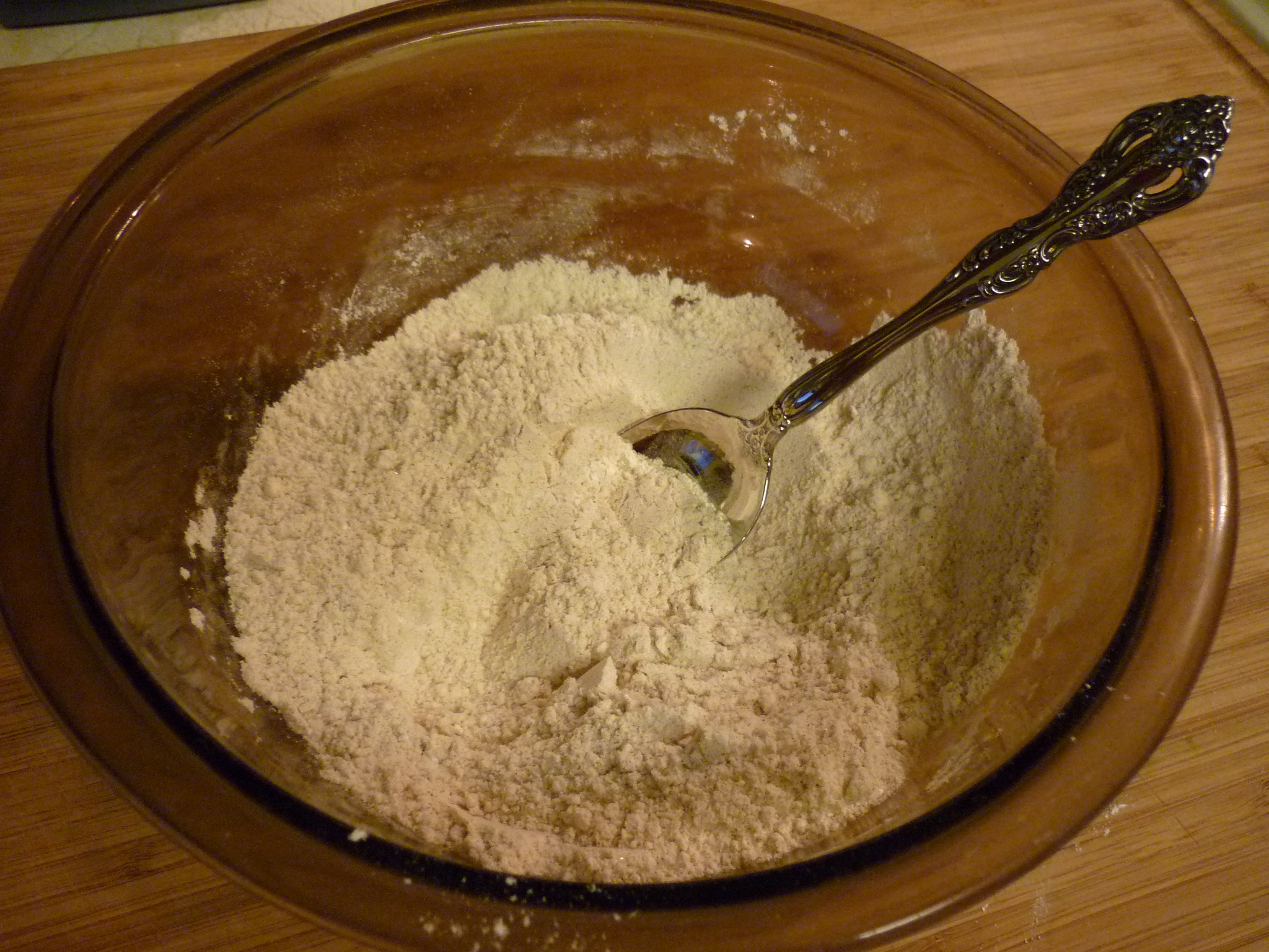 In a medium bowl stir together 1/2 cup flour, 2 Tbsp. sugar, 1 tsp. baking powder, 1 tsp. baking soda, 1/2 tsp. cinnamon, 1/3 tsp. salt. I do this part the night before as well. That way when I wake up there are only a few steps remaining.
