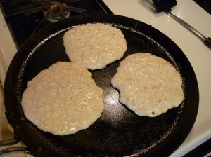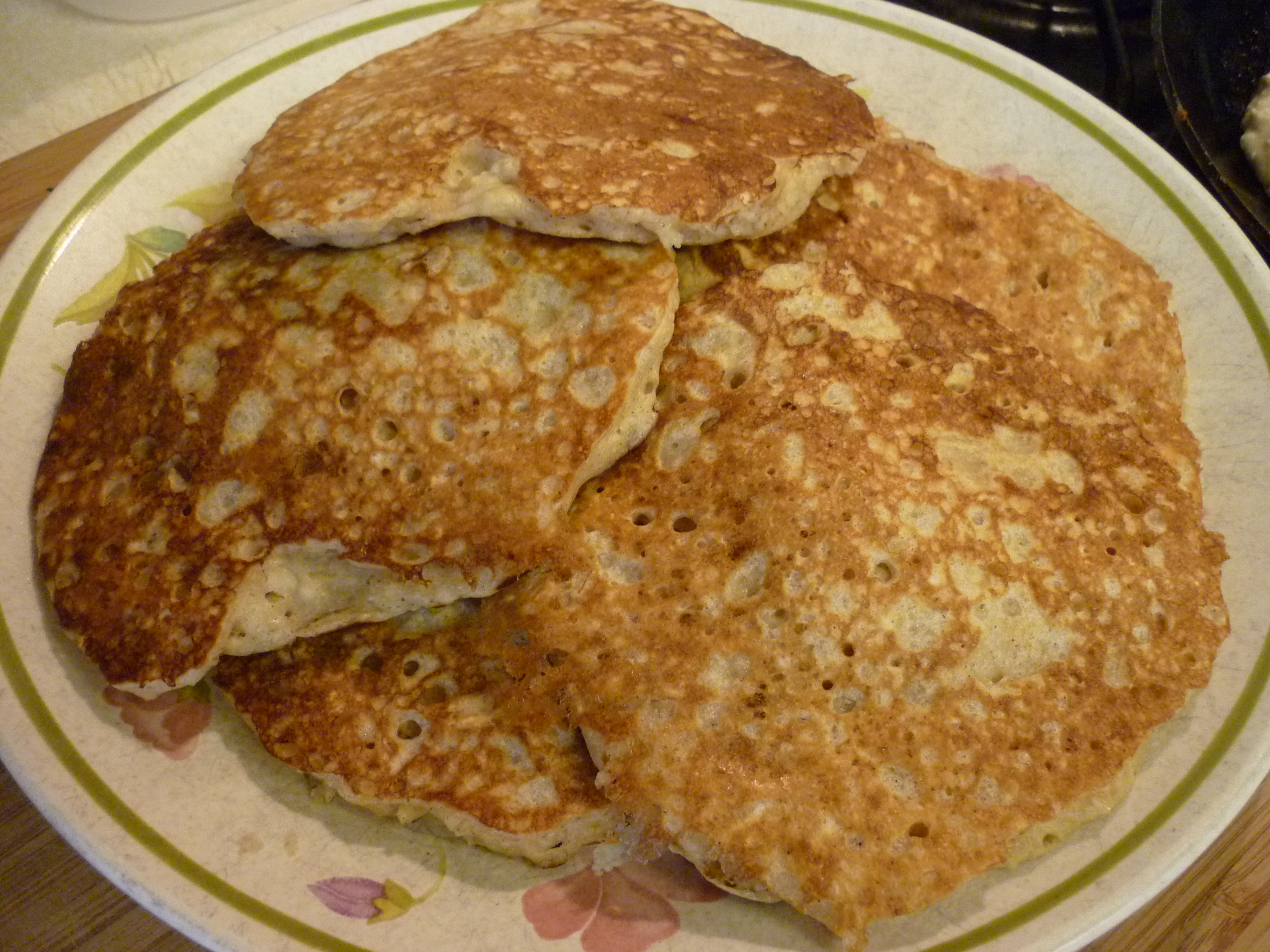 So, I am cooking for a crowd of about ten people now. This morning I made Oat Pancakes. Please note that this must be started the night before, so planning is involved.