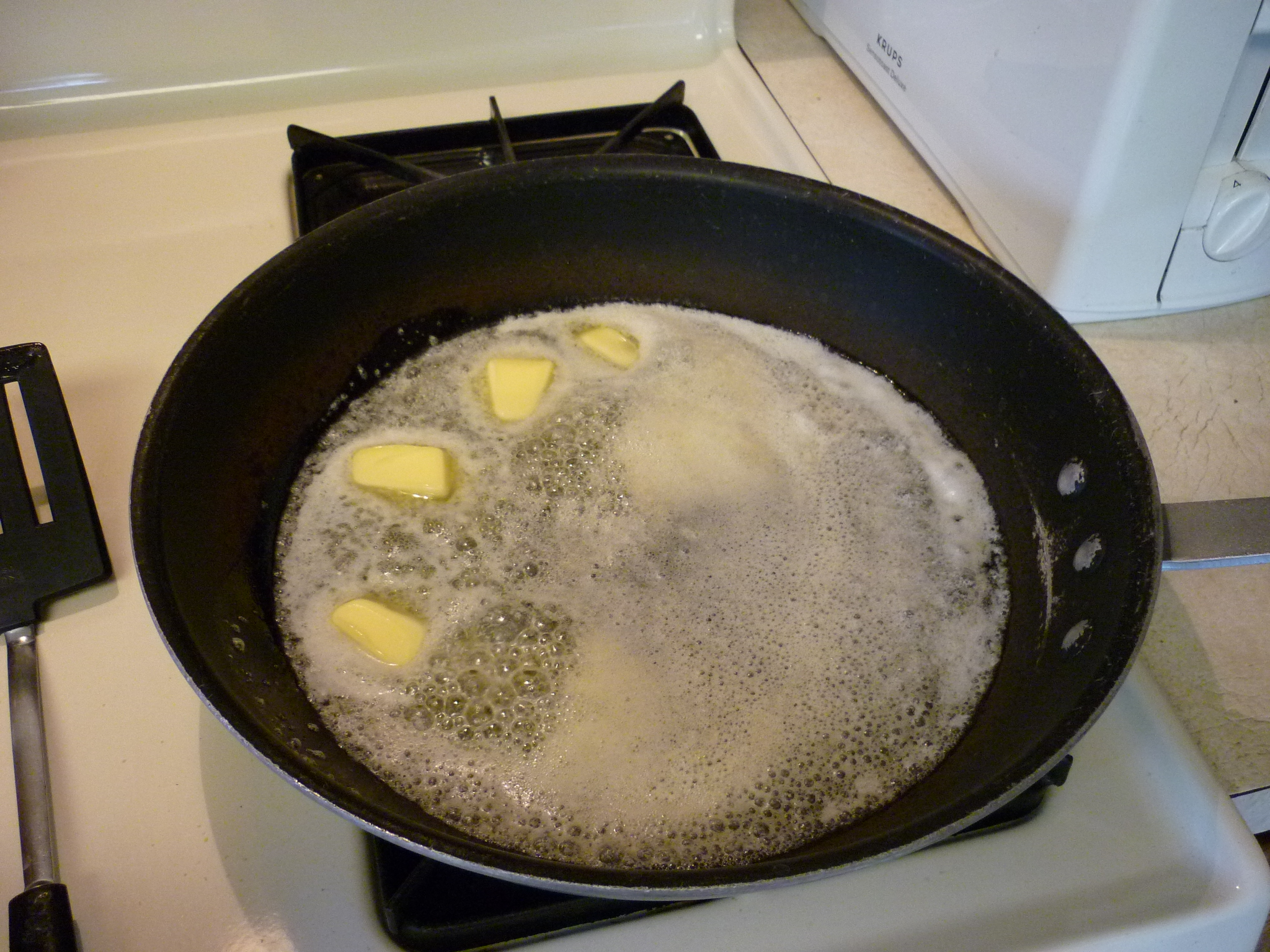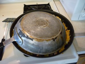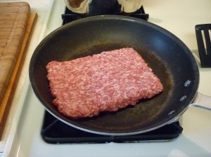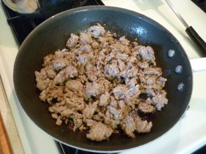 Meanwhile, heat 24 oz. tomato pasta sauce. Simmer for awhile so it’s somewhat thick. Use a spatter guard.