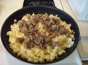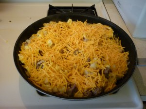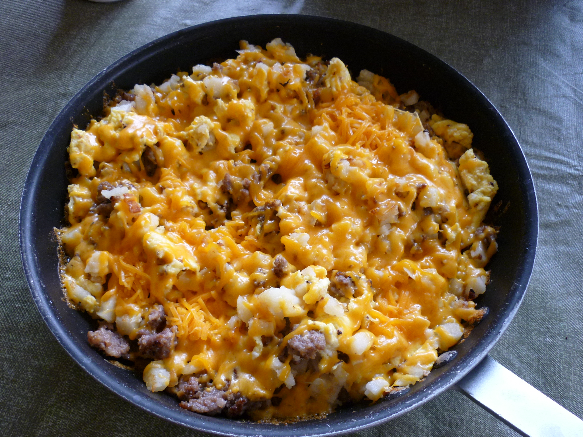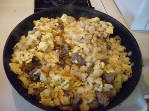 You will need two skillets (1 very large apx 14″ and 1 medium apx 12″). In the biggest skillet, melt butter over high heat. Add frozen hash browns and let fry on high heat until browned. Meanwhile in smaller skillet, fry breakfast sausage until cooked through. Turn the hashbrowns when brown and add sausage to the top of the hashbrowns. Don’t turn again until bottom is browned. Meanwhile, saute the optional ingredients over medium heat in the smaller skillet until they are cooked. Add to the top of the sausage in the hashbrown skillet. Scramble the eggs in the smaller skillet until cooked through. By this time the hashbrowns should be browned and you should start turning them so they cook through and are browned a little. Stir in the meat and veges. Add the eggs and stir in. Once the potatoes are all cooked, sprinkle cheese over the top. Turn the skillet to low. Turn the medium skillet upside down on the large skillet to make the cheese melt faster on the top. Once the cheese is mostly melted, remove the medium skillet and serve. Serves 6-8.