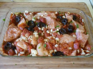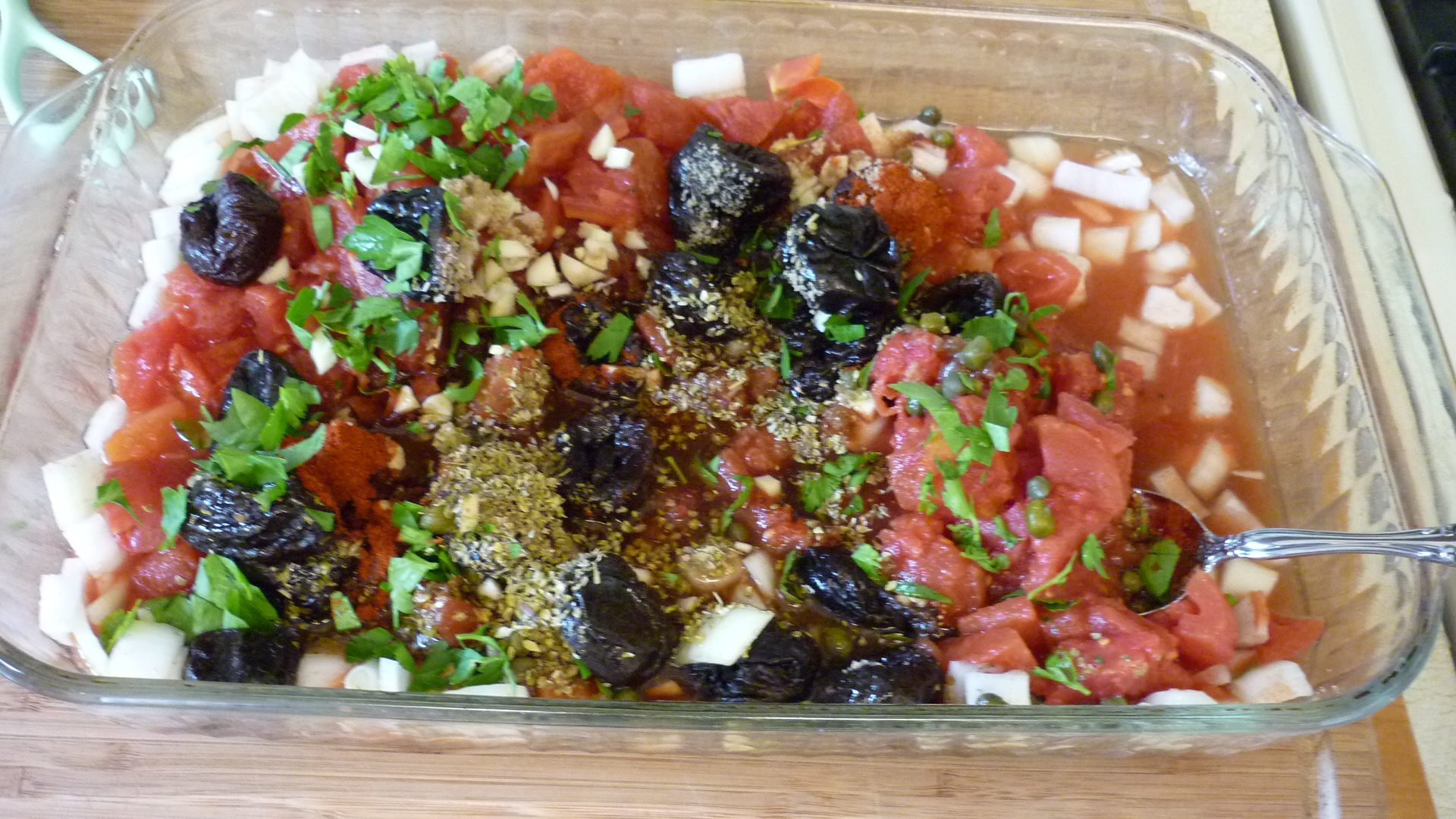 This is a great dish when you’re feeding a crowd. It should be prepared the night before, but I’ve done it just a few hours ahead and it’s still delicious. I also have a similar recipe which uses green olives and no tomatoes. Some day I’ll make and post that one.