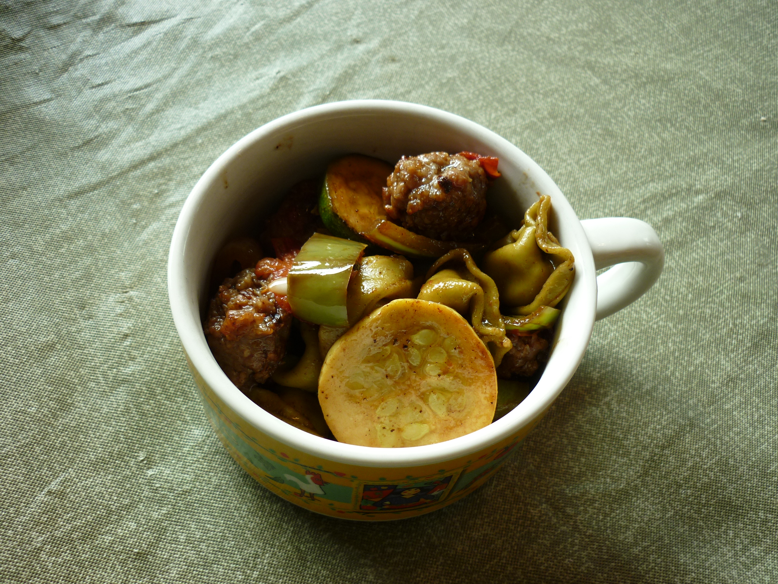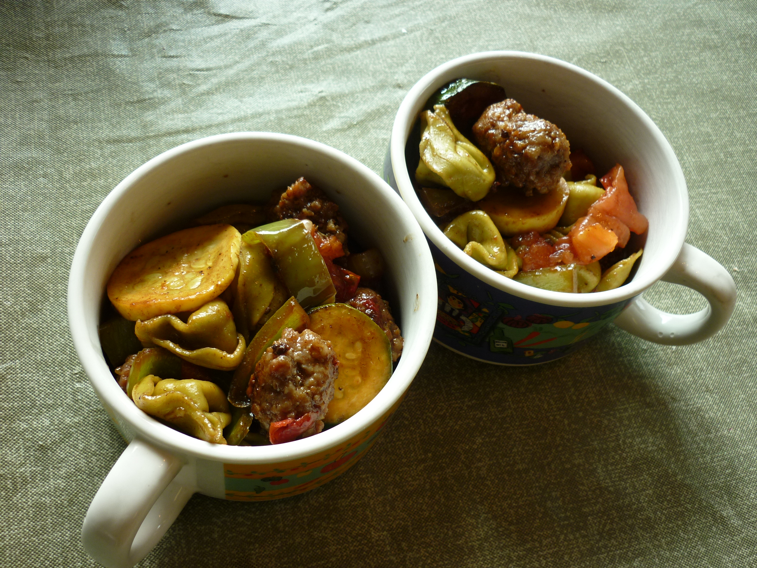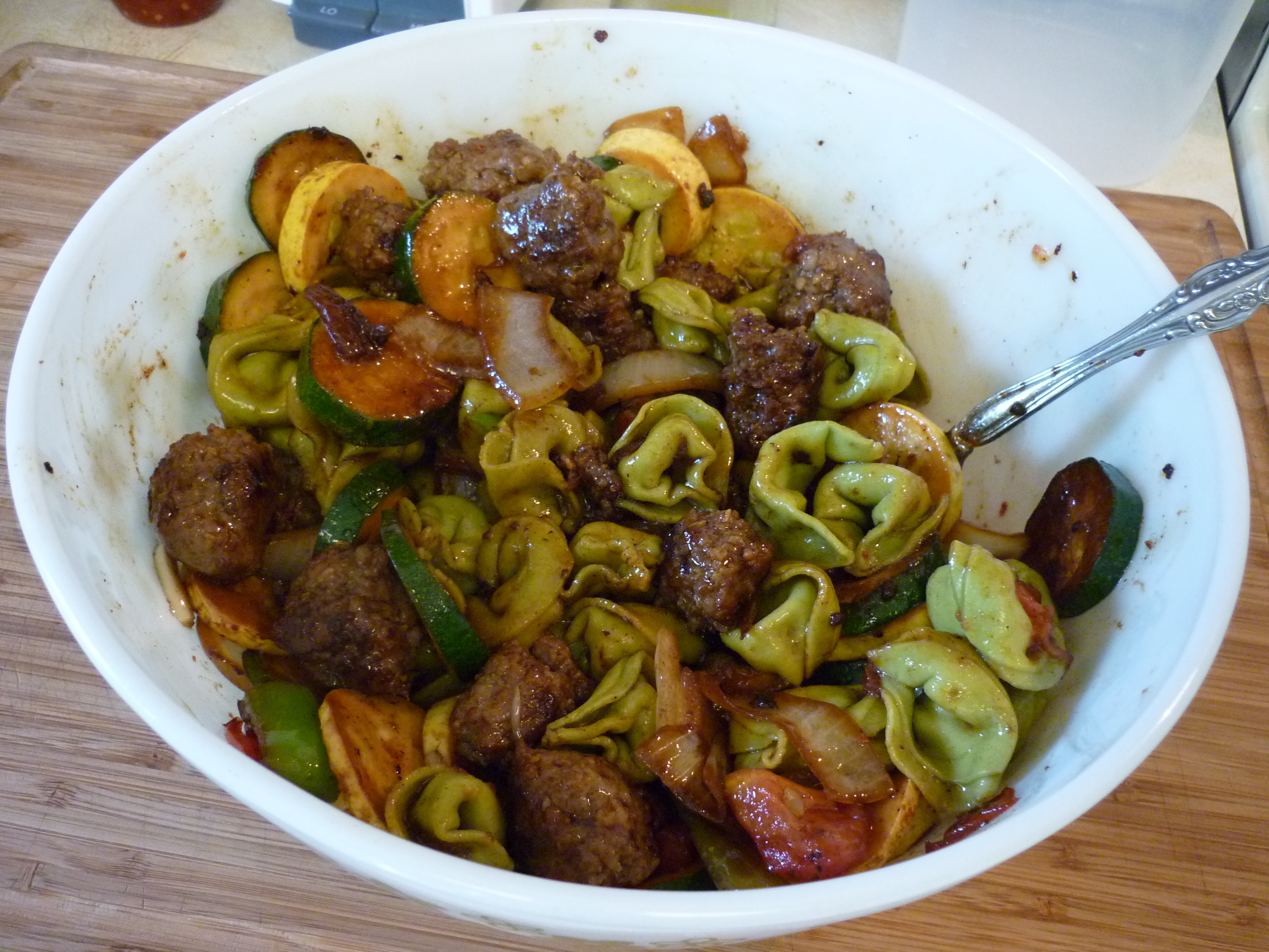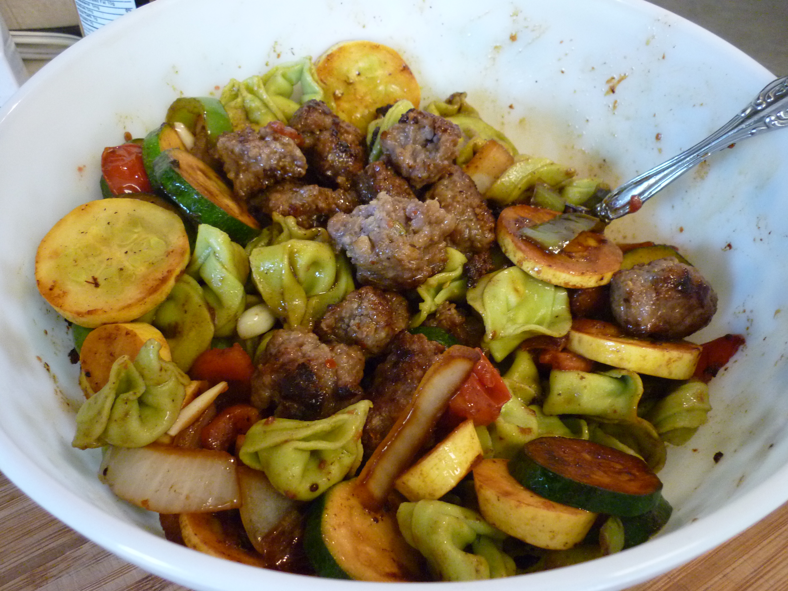 This is another dish I make frequently when I’m in a hurry. There are no specific ingredients, just a description. I buy fresh tortellini, any flavor or size package, from the deli section of the grocery. Prepare it according the directions on the package. While that water is boiling, fry up about a pound of Italian sausage, either bulk or links. If using links, slice them once they’re cooked . . . or before cooking. The goal here is to try for pieces of vegetables and meat which are of the same size as the tortellini. Don’t ask me why, it just seems to be more pleasing to the eye. Once the sausage is cooked, remove to a large serving bowl. In the same frying pan as you cooked the sausage, heat olive oil and stir-fry onion, pepper (bell, Anaheim, whatever kind seems good to you), garlic, zucchini, yellow squash, mushrooms, parsley, and/or cherry tomatoes (or chopped tomato flesh). Once the vegetables are sauteed appropriately, add them to the sausage in your big serving bowl. Once the tortellini is cooked, drain and rinse with cold water to stop the cooking process. Add tortellini to the bowl. Add a can of sliced black olives and a can of artichoke hearts (or cooked fresh or frozen). You don’t need to have all these ingredients all the time. Make a vinaigrette of balsamic vinegar and olive oil. When I made this dish the other night, unexpected visitors showed up and I couldn’t keep them out of the tortellini long enough to make the vinaigrette so I just splashed balsamic vinegar over the top and then drizzled olive oil over all, stirred it around and served it to rave reviews. It’s really not a fussy dish. Serve with garlic bread. You’ll be the toast of the neighborhood, or at least the toast of the house.