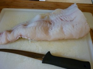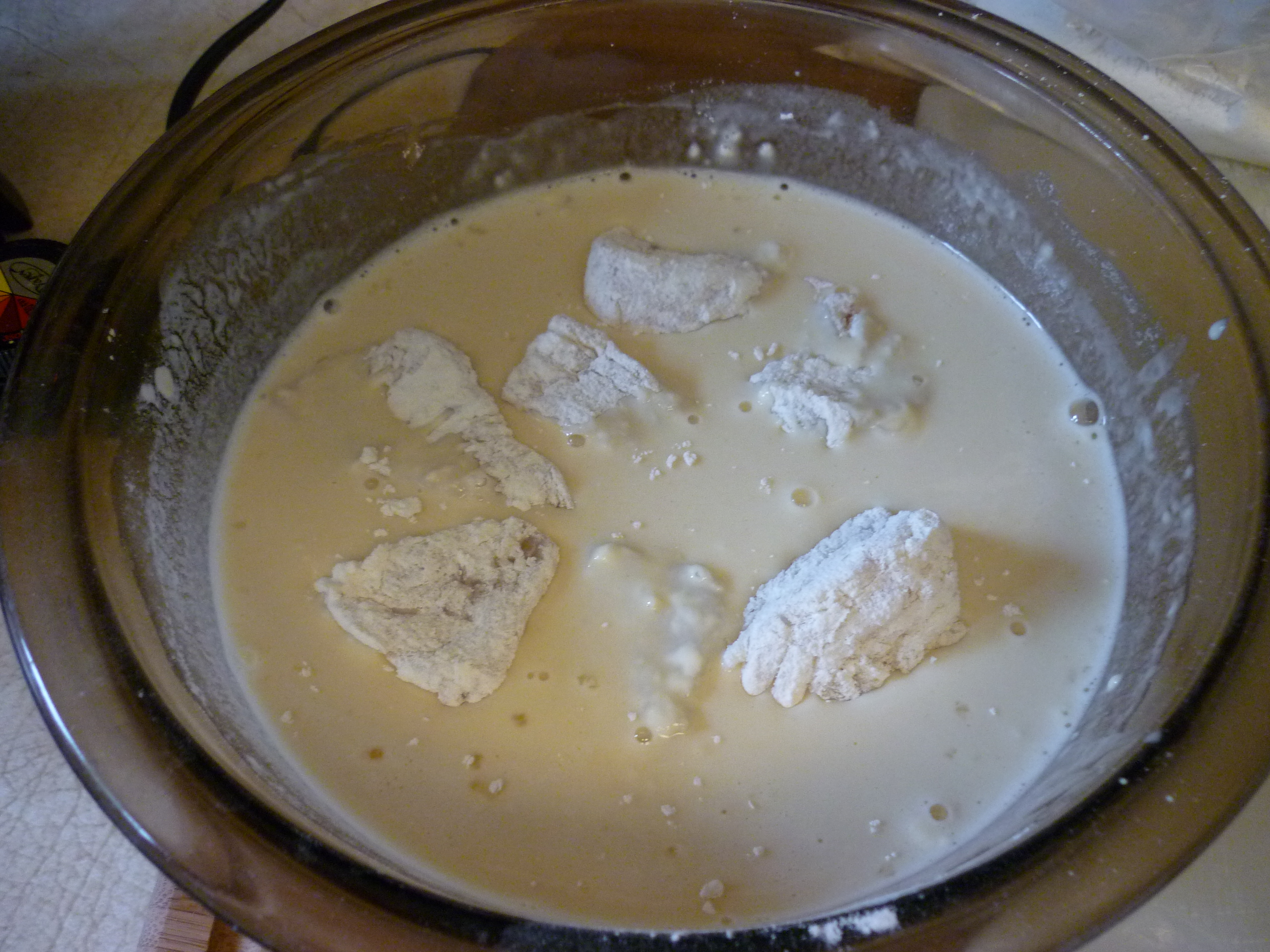 Cut halibut into 1″ chunks, approximately. Dredge halibut through flour, you’ll probably need about a cup of flour for this.