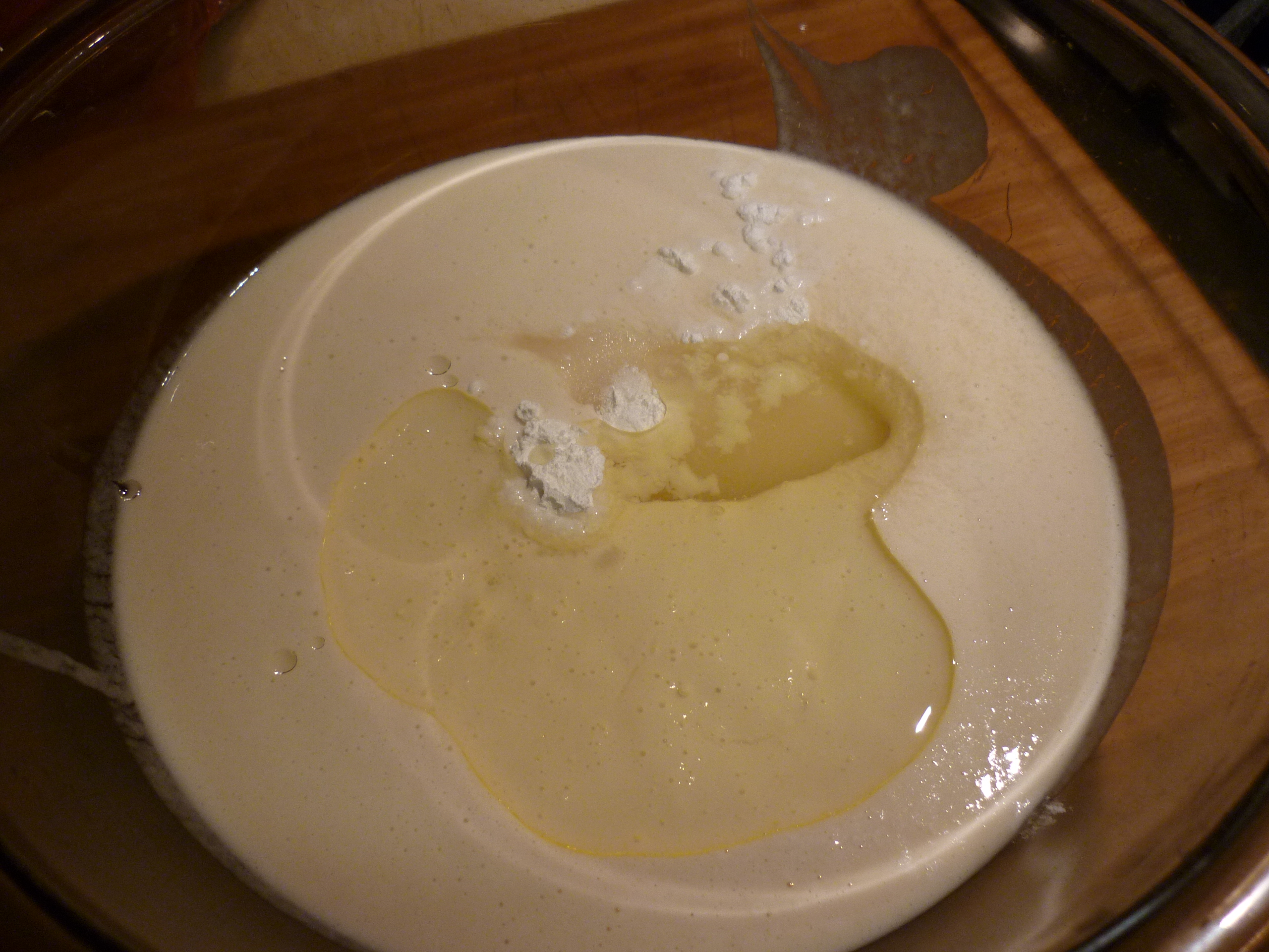 To the remaining mixture, stir in 2 Tbsp. sugar, 1 tsp. salt, ½ tsp. baking powder, and 3 Tbsp. oil.