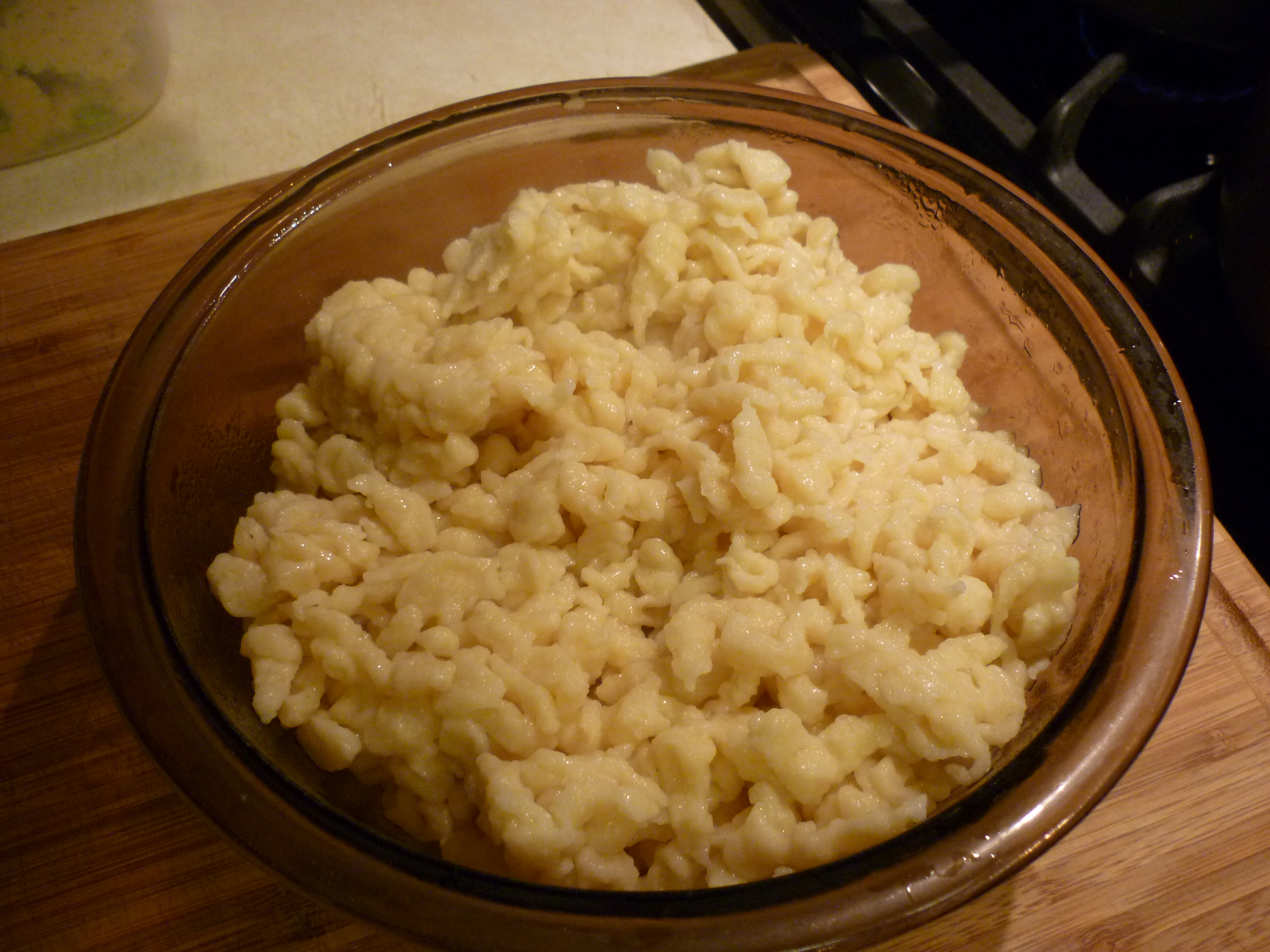 Alert: This recipe requires special equipment. There is a device called a spaetzle maker, which makes this recipe quite simple. The batter is dolloped into the bowl-shape you see here, then the bowl slides across the holes and the batter drips through. Alternatively you could use a flat cheese grater, although it takes more time. I’ve used a spoon a few times and it’s quite tedious. There may be other kinds of spaetzle makers, too.