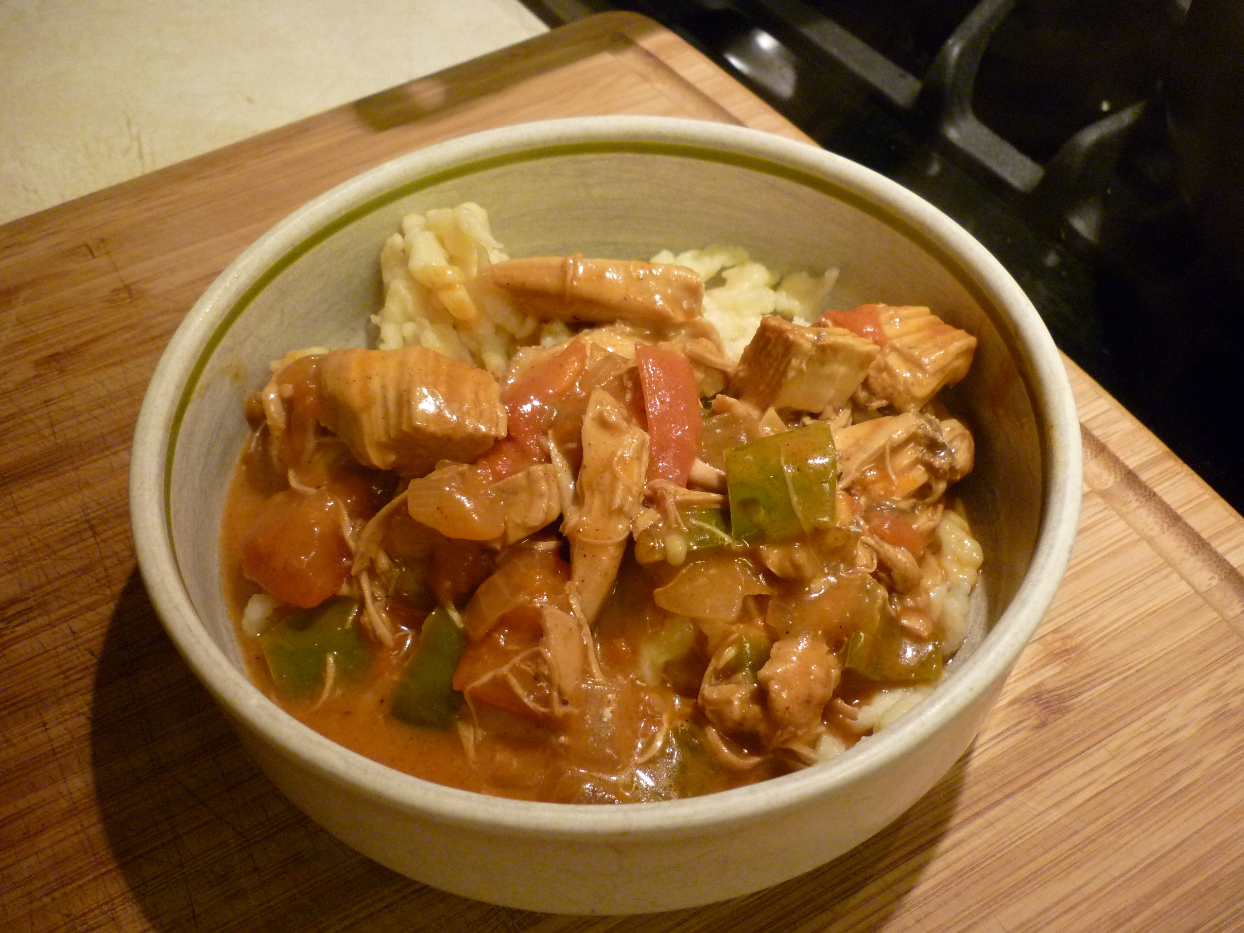 In a large skillet heat 3-4 Tbsp. oil and then saute 1 Tbsp. Hungarian paprika in it for a minute. Add a cup of chopped onions and saute for a few minutes. Stir in 2 Anaheim chile peppers, seeded & coarsely chopped; 1 medium tomato, chopped; 2 cloves garlic, peeled and minced; 3 cups chicken broth; salt and pepper to taste; enough chicken meat to suit you.