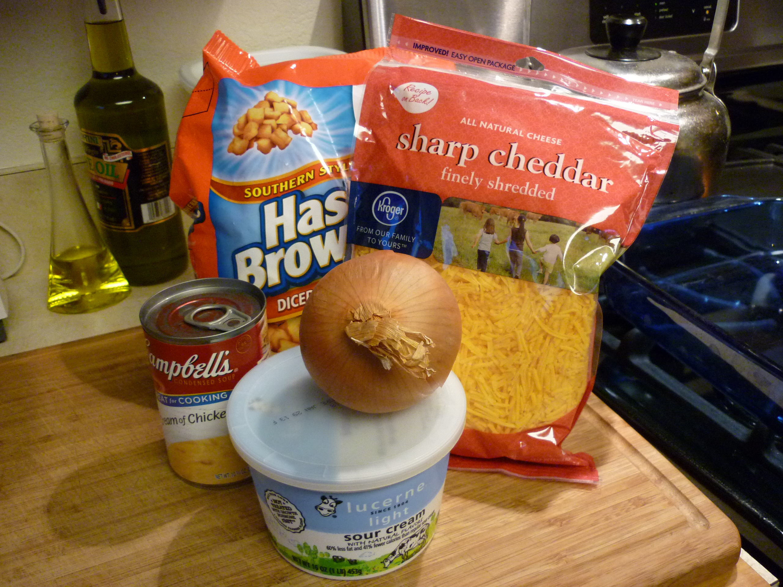 Let me just say right at the beginning . . . this recipe uses processed foods. It is a family favorite, the quintessential comfort food. Cheesy Potatoes is a nice accompaniment to ribs or meatloaf or fried chicken. You will need an extremely large bowl (mine is 32 cups) to mix it in. Do not thaw the potatoes, use them straight from the bag.