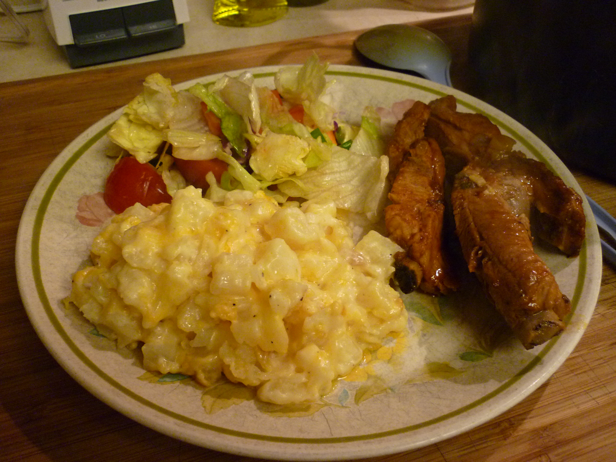 Another favorite, this is based upon the recipe in Betty Crocker’s Cookbook (1969). It goes really great with bratwurst. The dinner you see pictured here includes bratwurst and sauerkraut, but neither of those are in this potato salad recipe. Just sayin’.