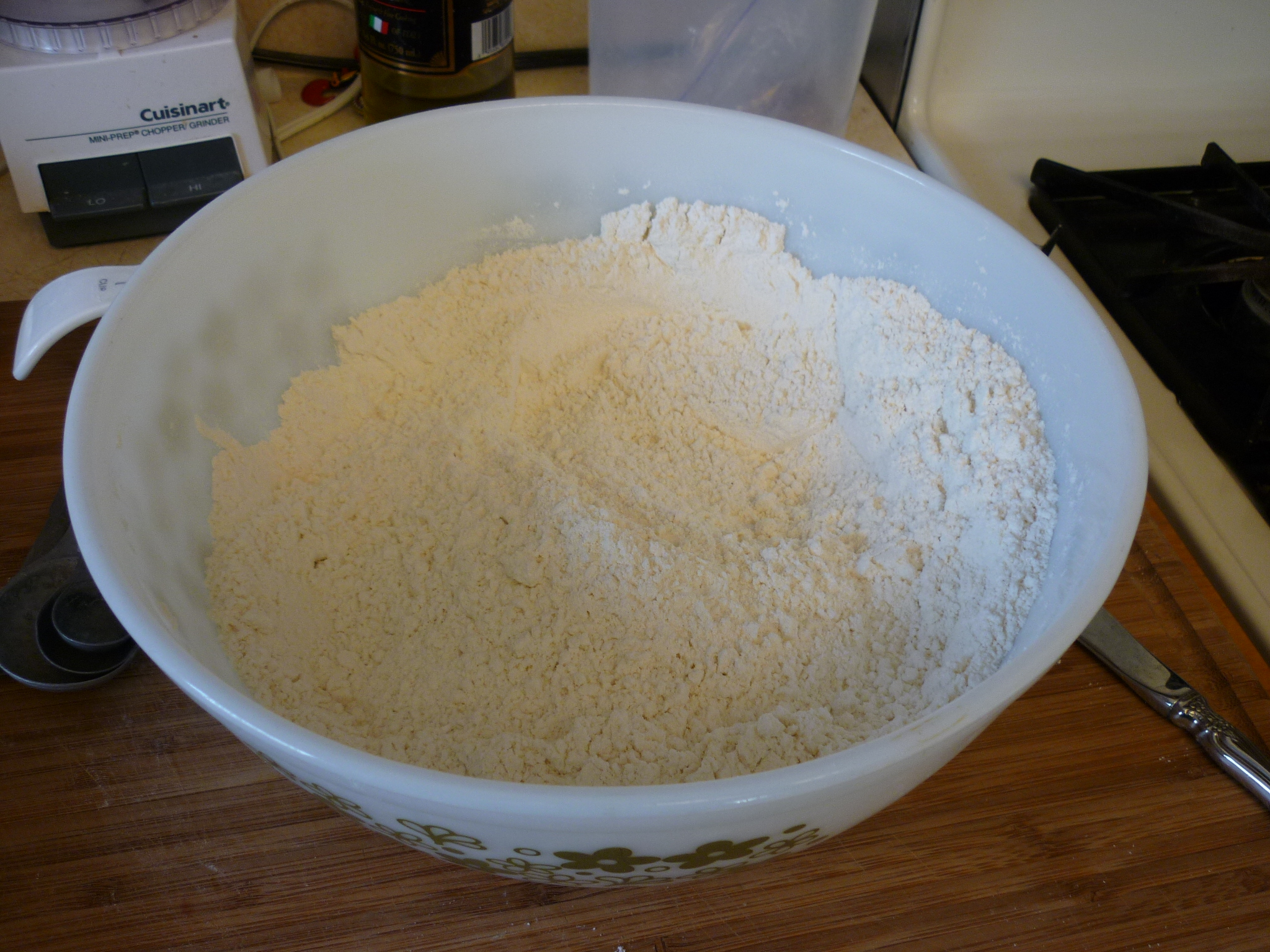 Stir dry ingredients together, then cut in butter. Mix in liquid ingredients. Remove to flour-covered board and briefly knead.