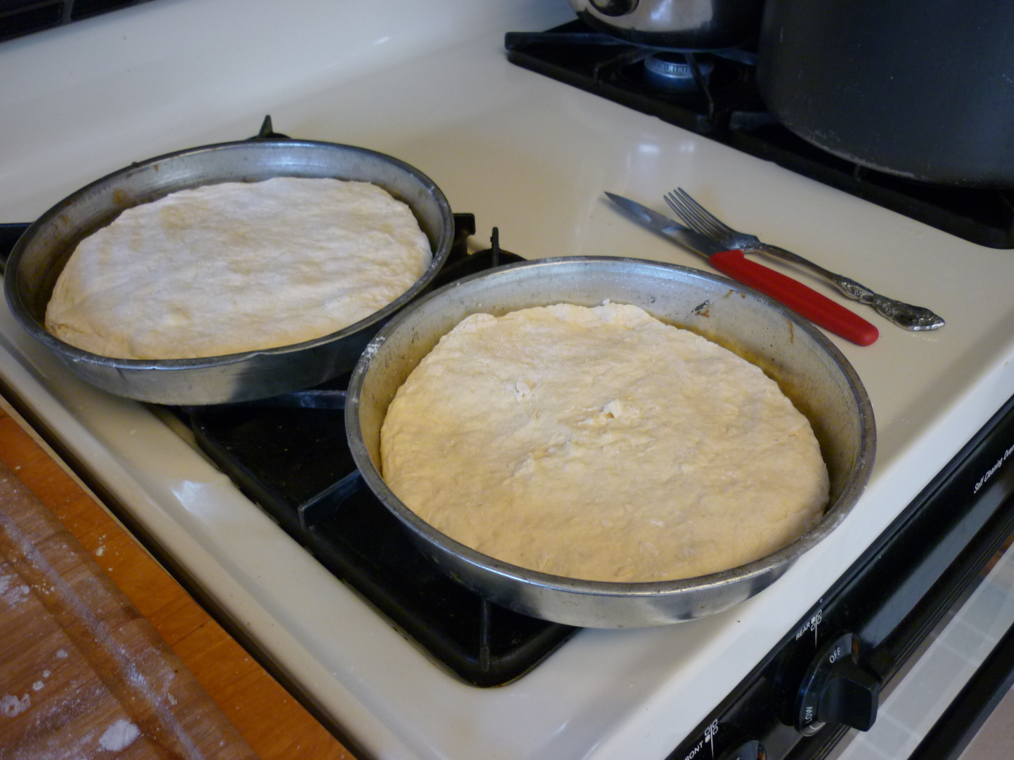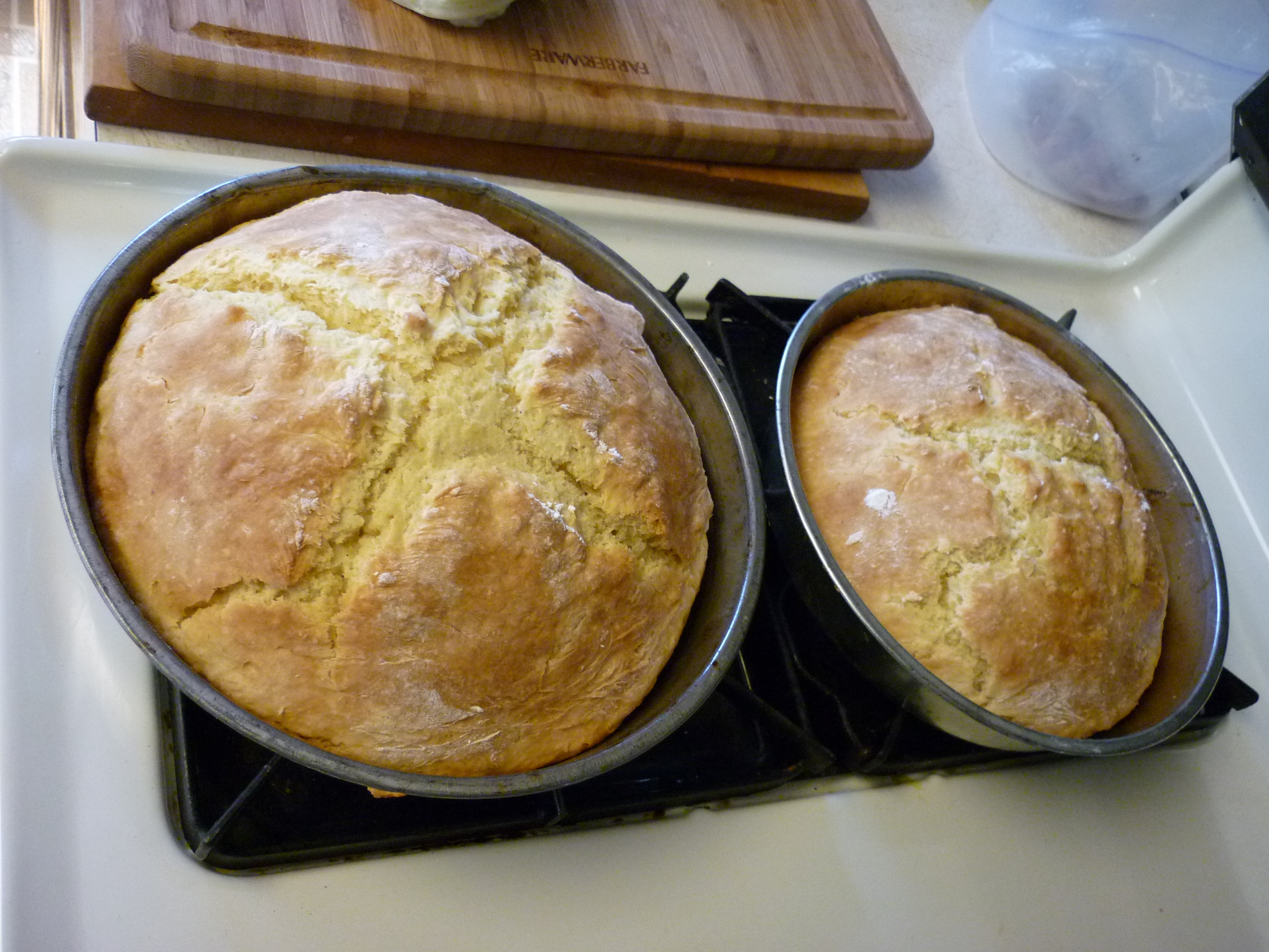 Divide dough in half and shape each half into a smooth, round loaf; place each loaf in a greased 8” cake or pie plan and press to make dough fill pans. With a razor blade or sharp floured kife, cut a 1/2” deep cross in top of each loaf.