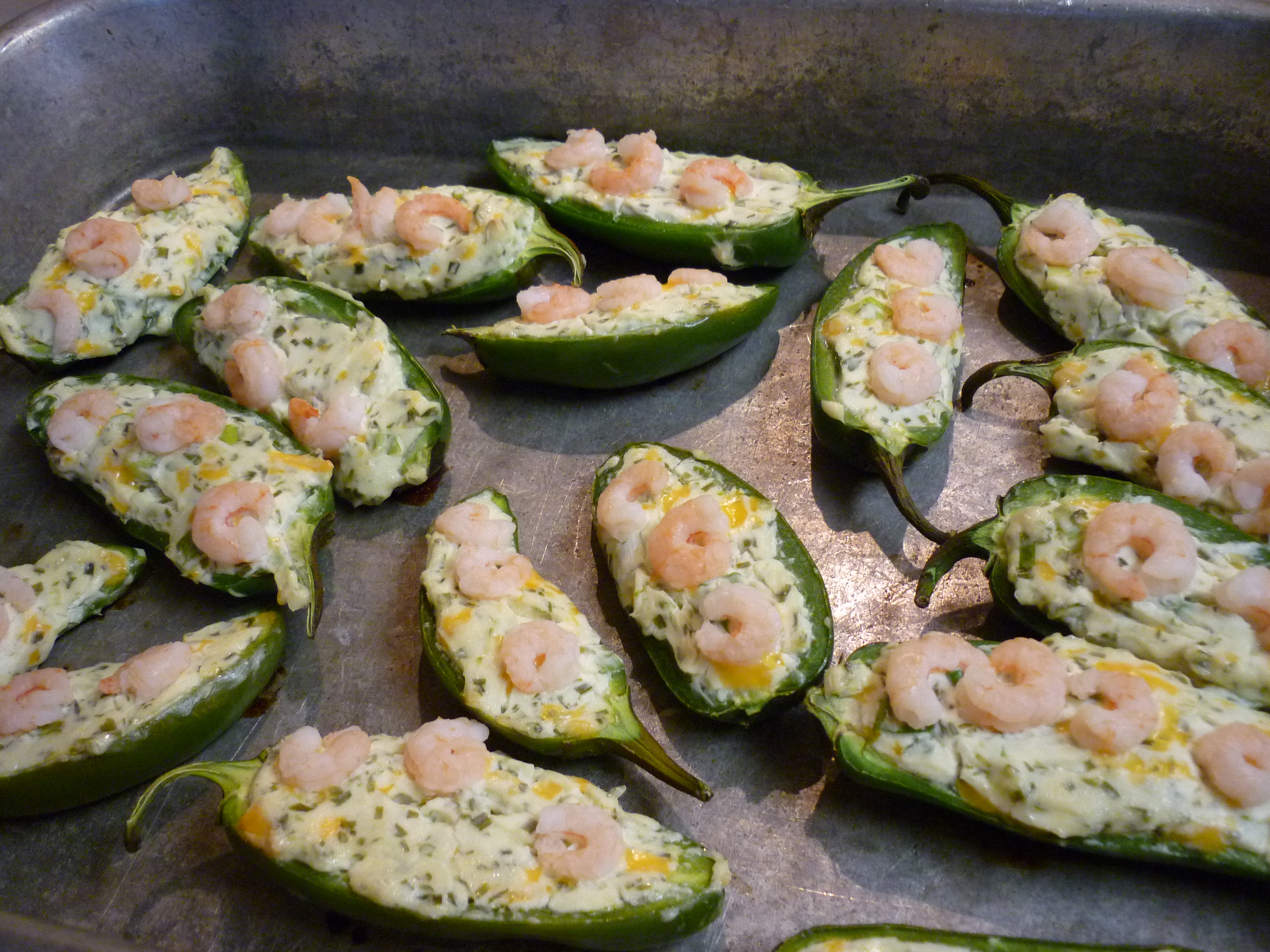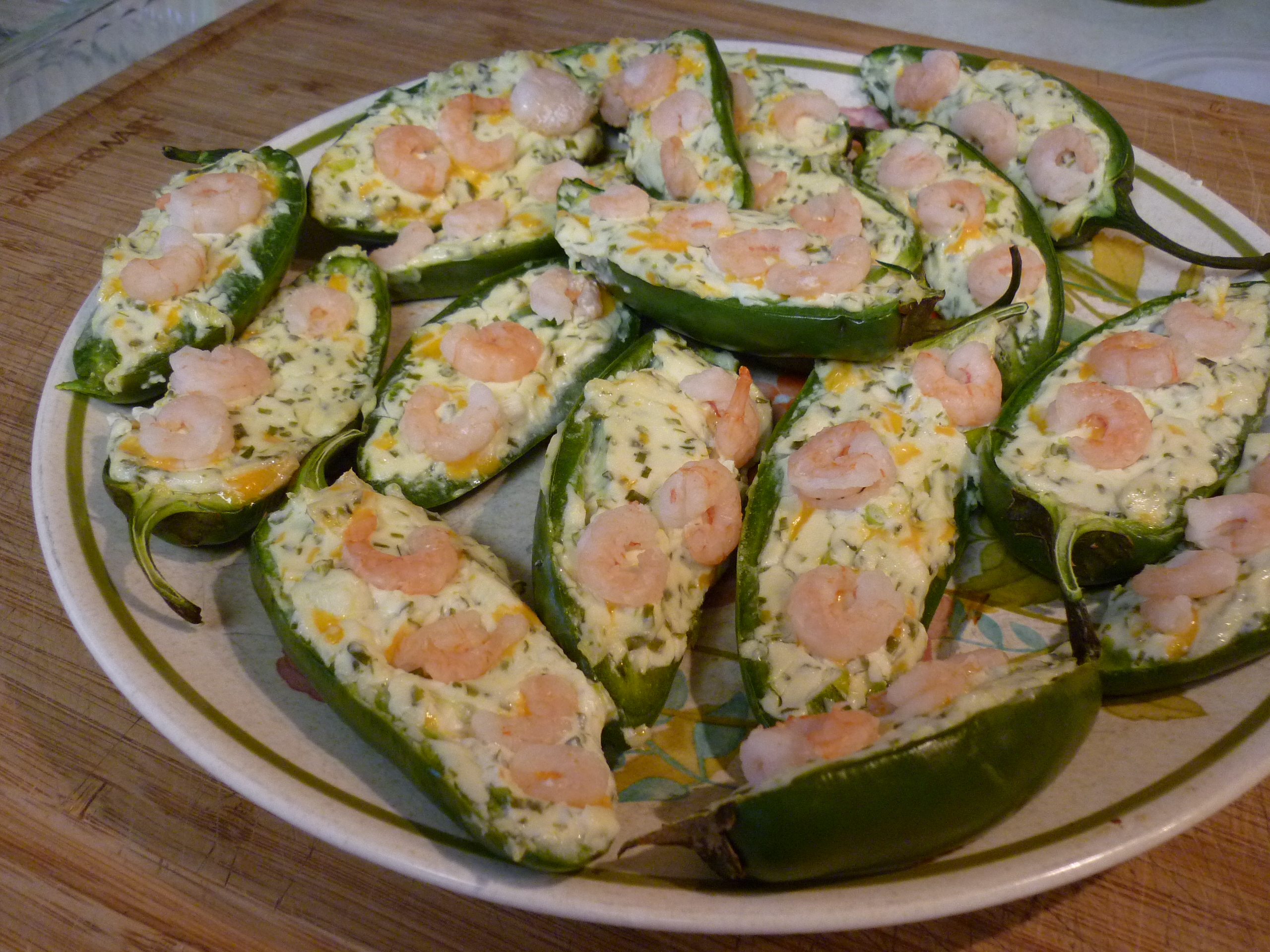 Cut jalapeños in half lengthwise and scoop out the seeds into the trash. Place the jalapeños into an ungreased 15×10” baking pan or on a baking sheet. In a small bowl combine cream cheese, cheddar cheese and onions. Spoon into the jalapeño halves. Top with shrimp in a decorative manner. Bake at 400 degrees for 18-22 minutes or until jalapeños are tender. Yield 18 appetizers.