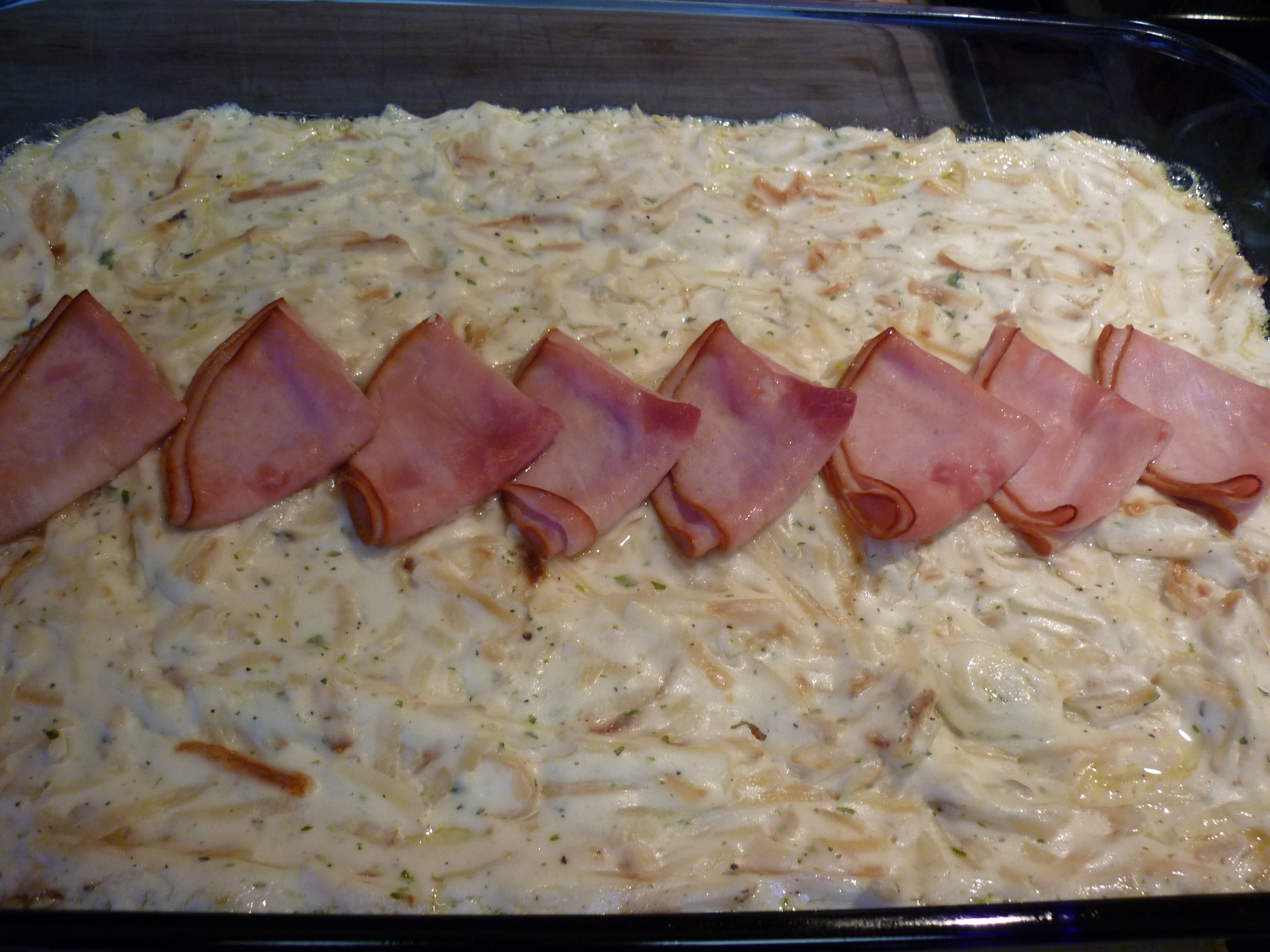 Layer 8 slices Canadian bacon or ham lunch meat or leftover ham slices along the center of the dish decoratively. I used ham lunch meat rounds, folded into quarters, for today’s illustration.