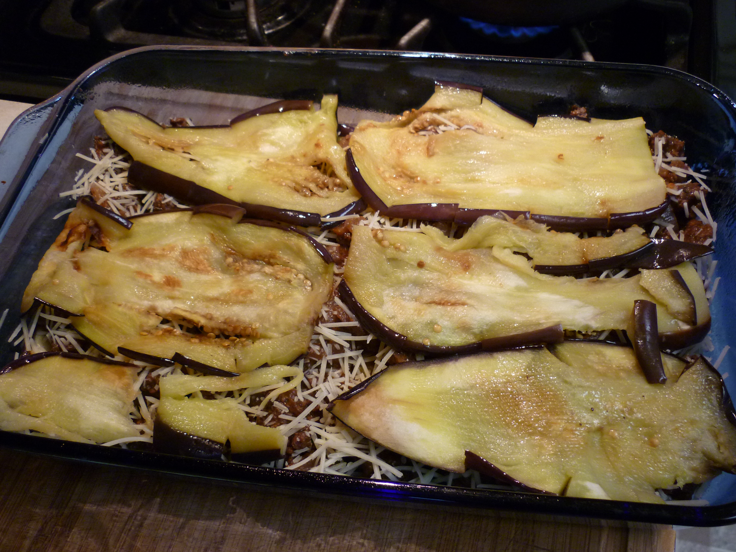 - Arrange a layer of eggplant in a greased 9×13 inch baking dish. Cover eggplant with all of the meat mixture, and then sprinkle 1/2 cup of Parmesan cheese over the meat. Cover with remaining eggplant, and sprinkle another 1/2 cup of cheese on top. Pour the white sauce over the top, and sprinkle with the remaining cheese.