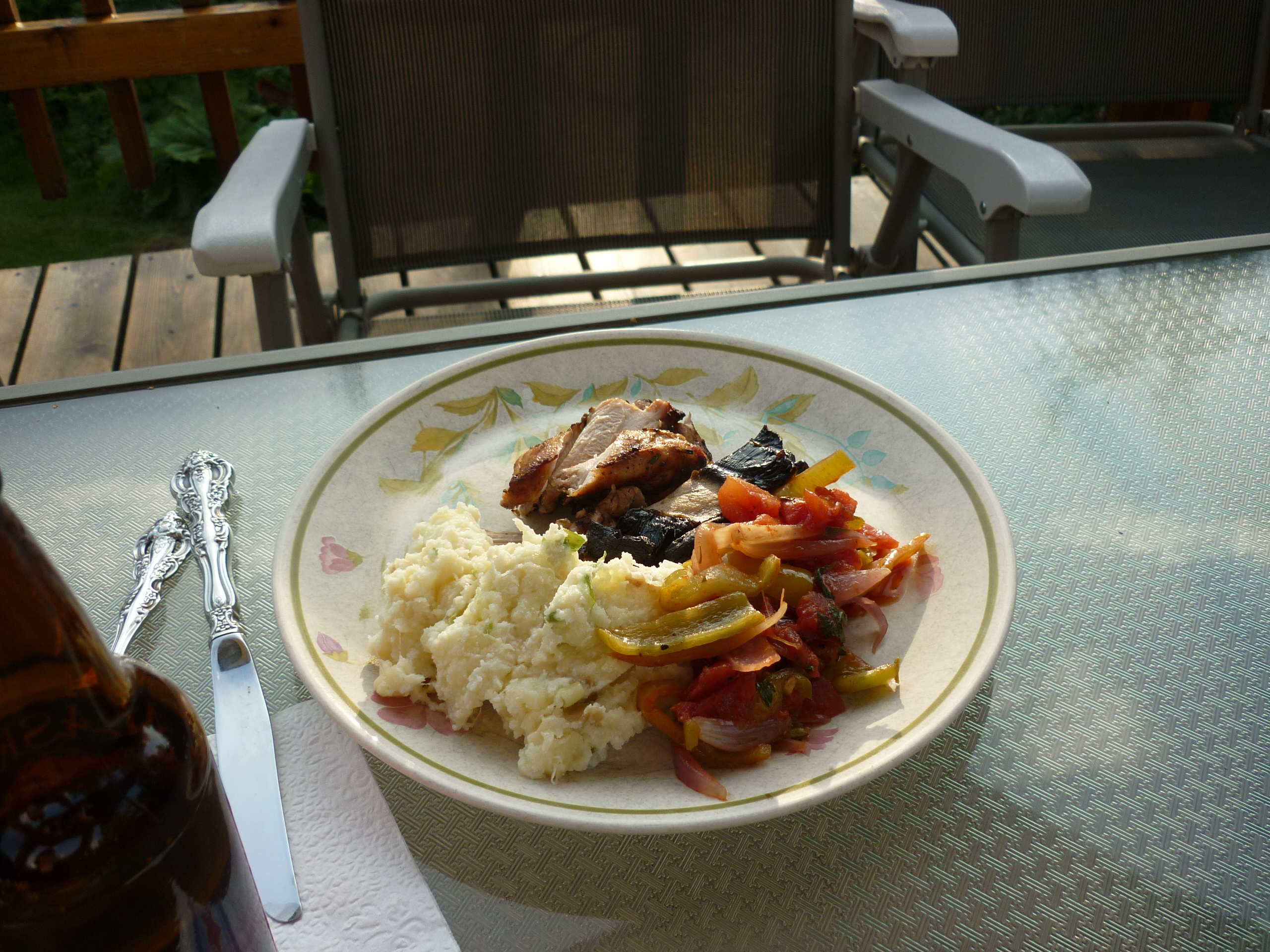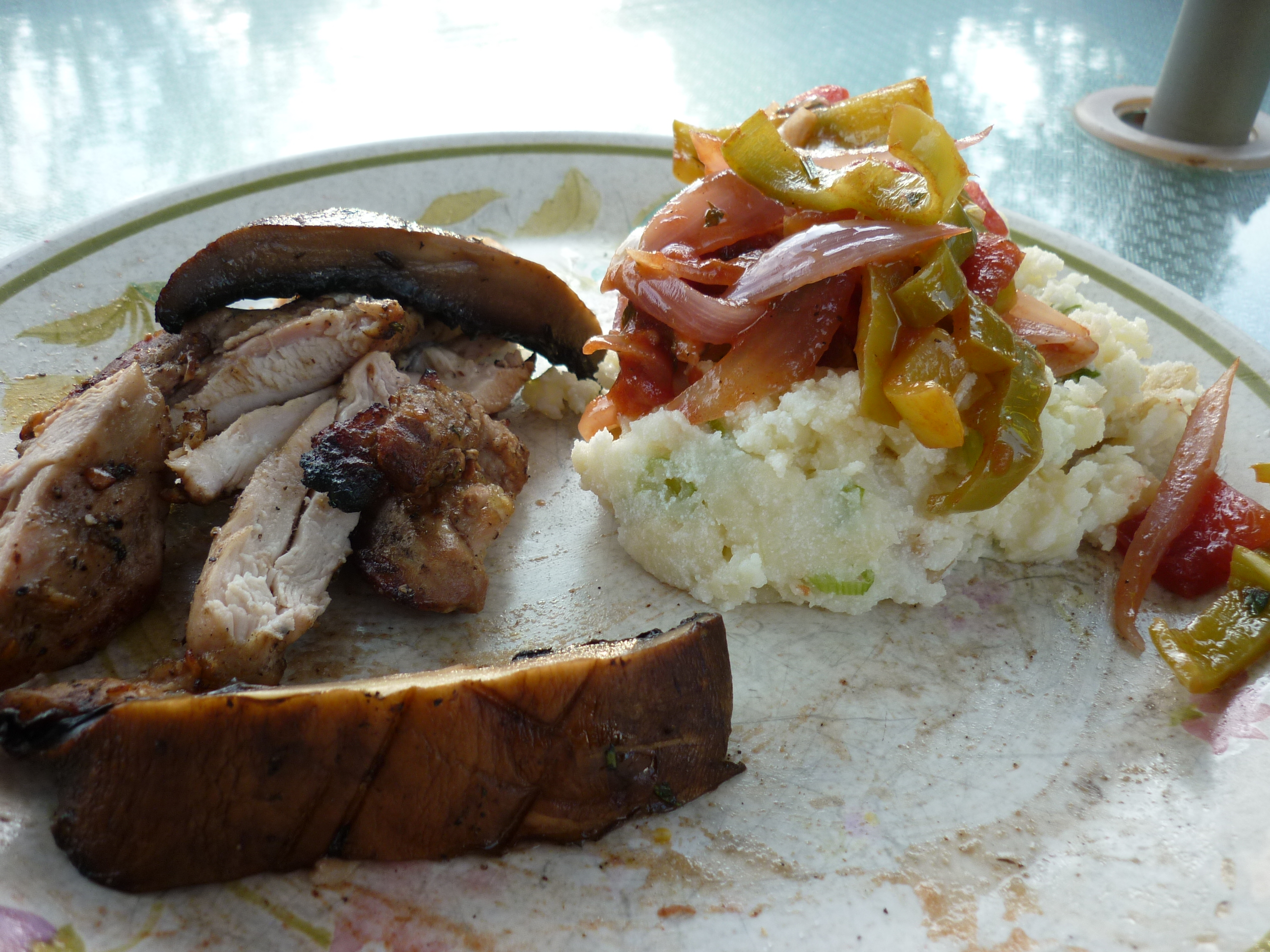 Based upon a fabulous Rachael Ray recipe found here. This is a somewhat complicated endeavor. It isn’t hard, it’s just a lot of moving pieces going at the same time. I’m going to break this down into two parts, but keep in mind that the potatoes should be going at the same time as the rest of the meal. Rachael Ray did the whole thing in 30 minutes, I watched it. If all your prep work was done and you had a cooperative grill, you could do it quickly too. I have made this recipe many, many times. When we’re dieting, I don’t make the potatoes. I’ve gotten to the point where I usually just eyeball all the amounts. It’s not a fussy dish.
