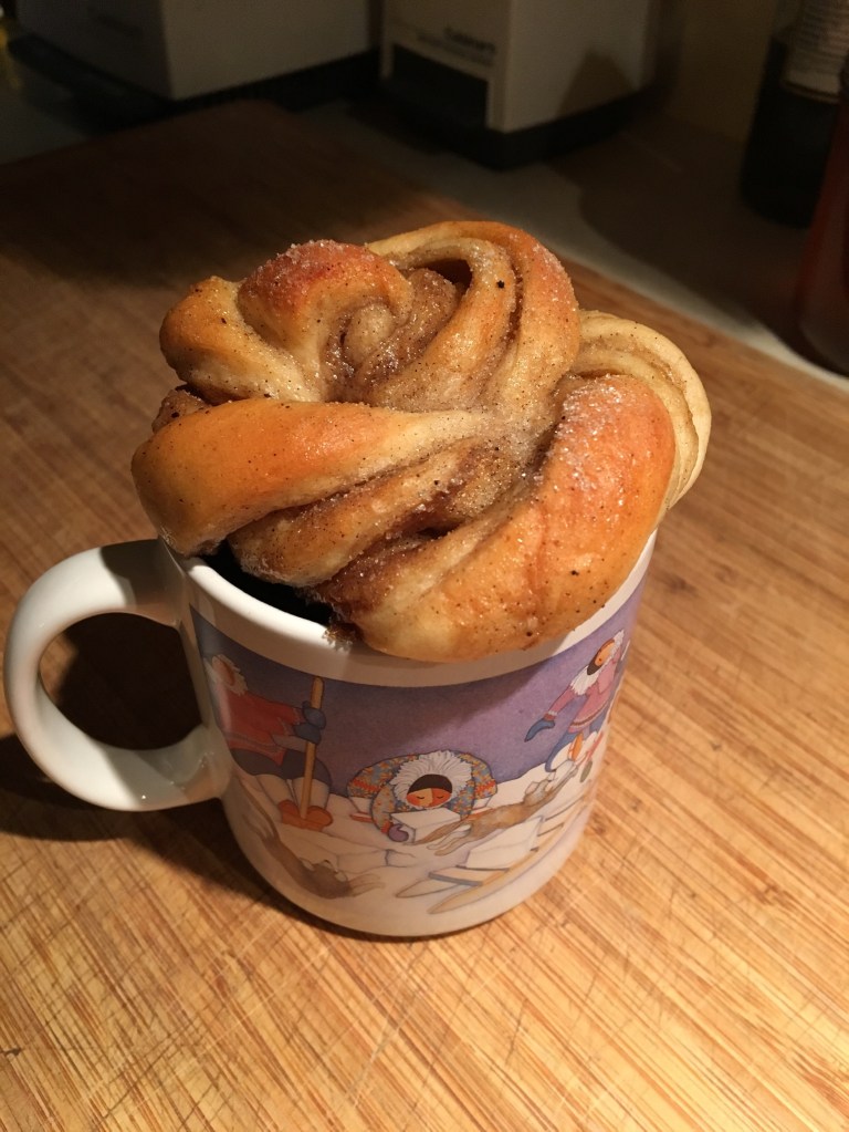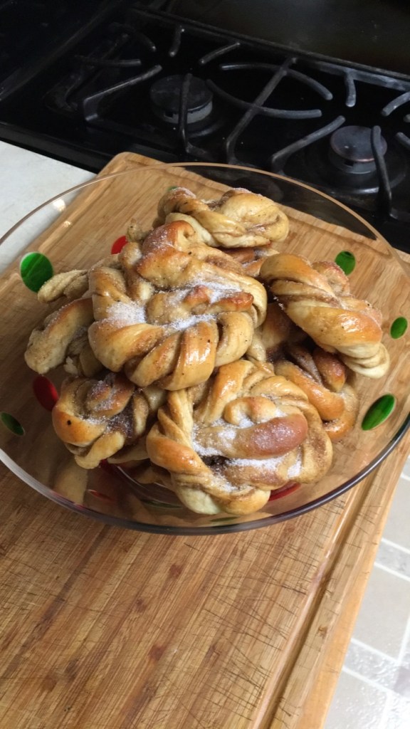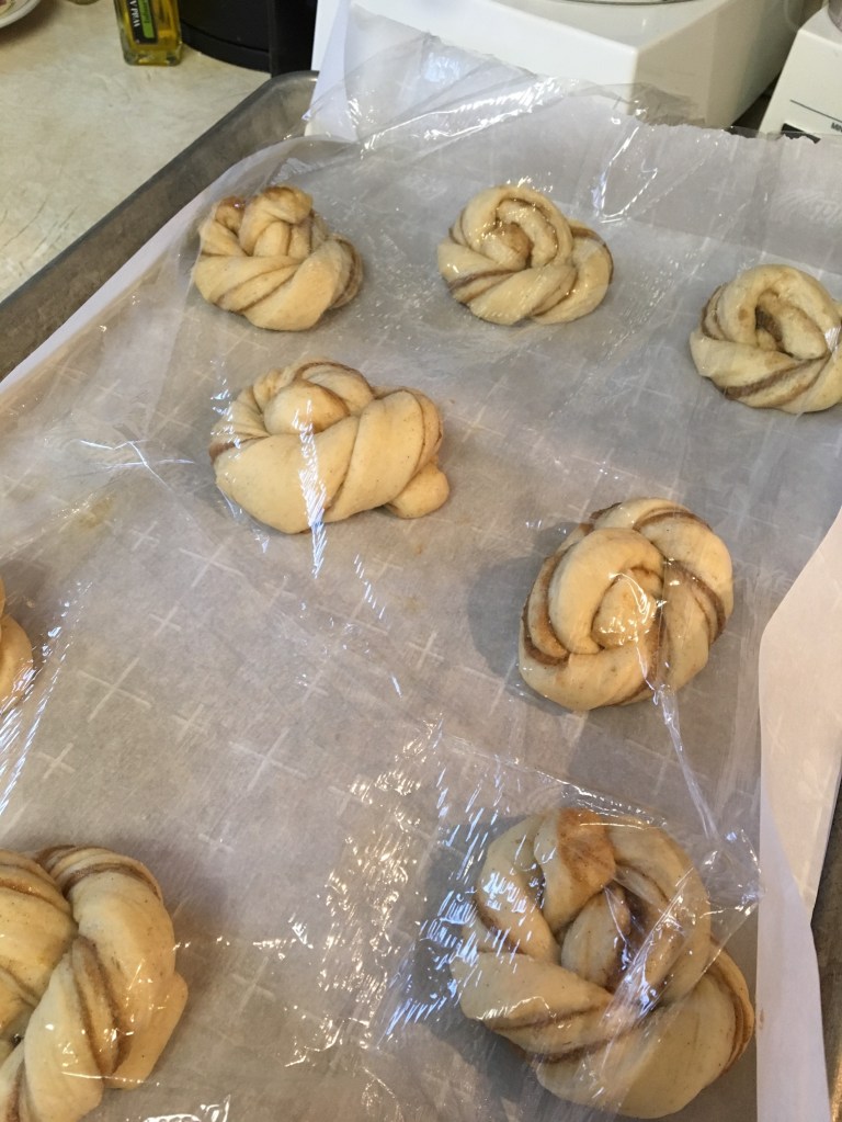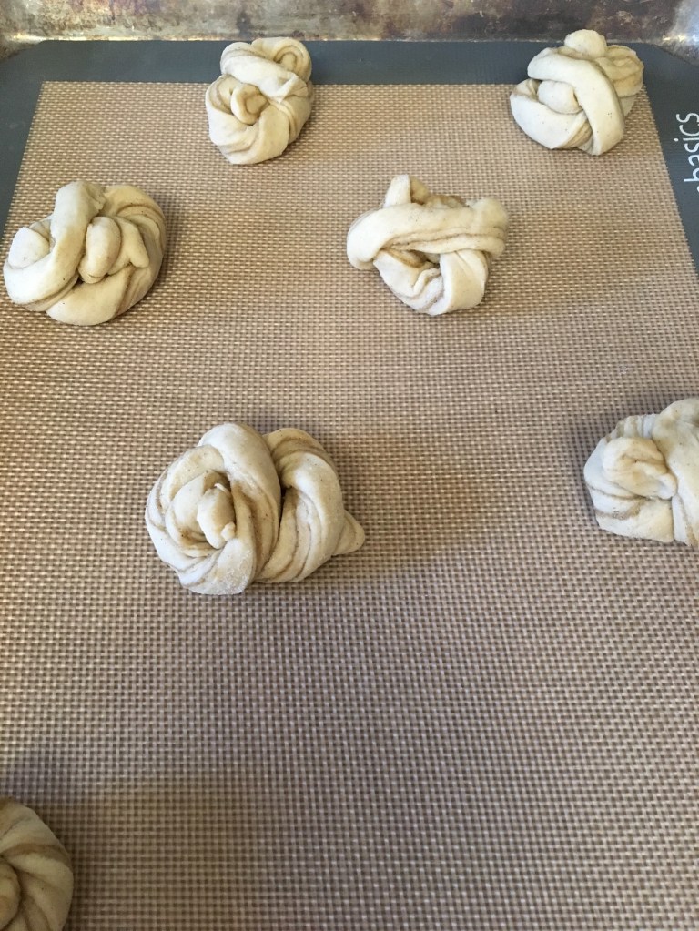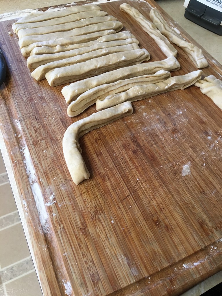 Fold the long side of the dough evenly into thirds toward the center (each third is 7″). Run the rolling pin over to compress slightly. Turn the dough so that the open ends are on the right and left sides. Starting at either left or right, cut the dough into thin strips. When finished, you should have 15 to 20 strips. Please go look at fixfeastflair.com to see how to do this next part. She’s got a gif that shows how to make the rolls. You take each strip and roll it around your hand, making sure the ends are firmly tucked underneath.