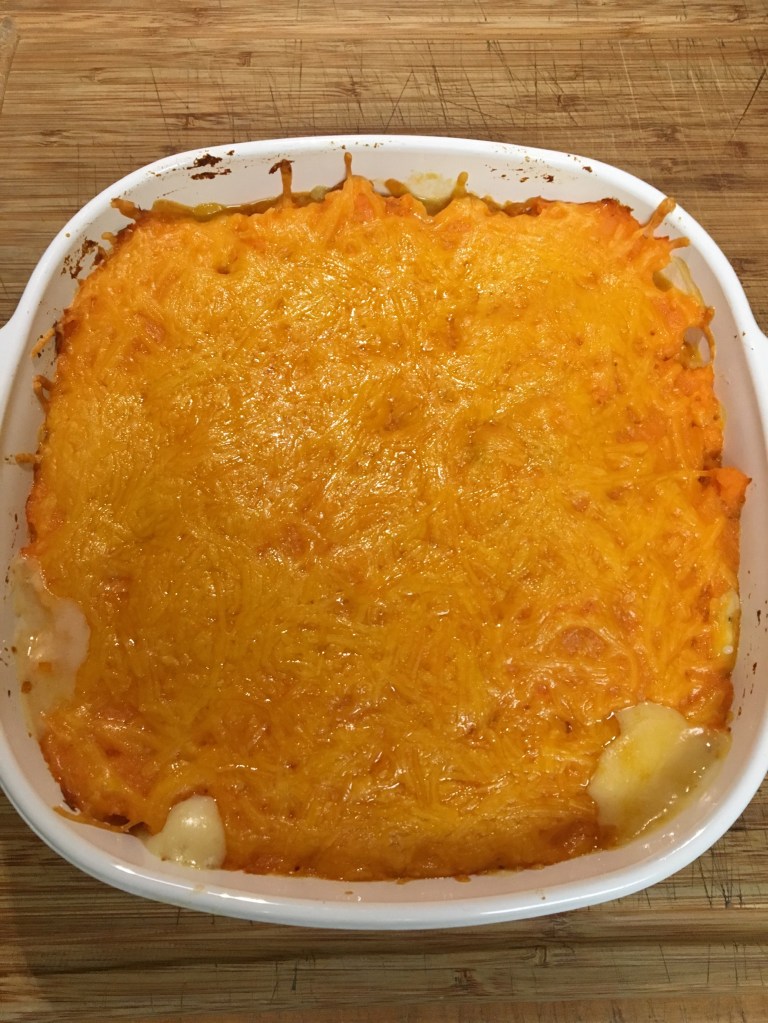 Dollop mashed sweet potatoes evenly over the filling in the baking dish. You can smooth it out or fluff it up, however you like. Sprinkle with remaining 2/3 cup grated cheese.