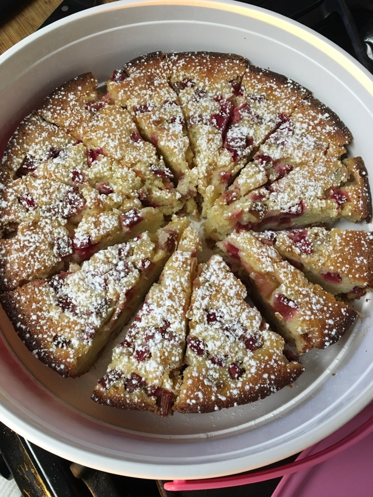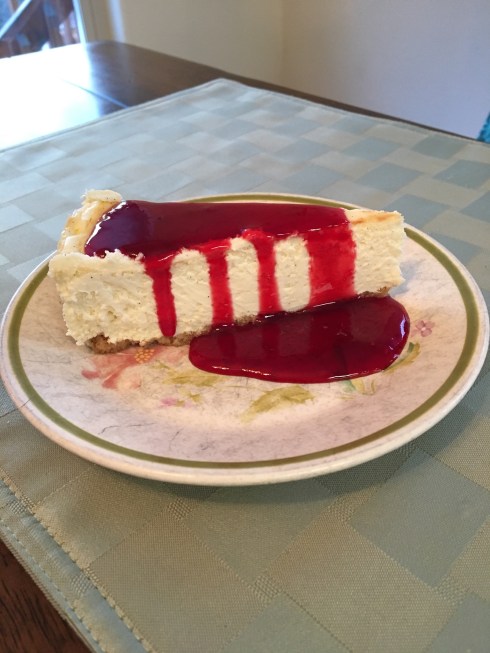 The cheesecake stands very well alone, but because I have a lot of frozen raspberries, I made a raspberry sauce to go with this deliciousness. I’m not a fan of raspberry seeds so I pressed my home-frozen package of thawed raspberries through a sieve and came up with 1-1/2 cups of juice/pulp. These type of sauces are not fussy so you can do your own thing regarding amounts. I was looking for something that would remain a semi-thick liquid when brought down to room temperature. I didn’t want a hot sauce to melt my cheesecake slices. At the same time I wanted the sauce to pour when I was ready for it. This worked very well. I gave the sauce a stir right before serving. I used a gravy boat to store and pour.
