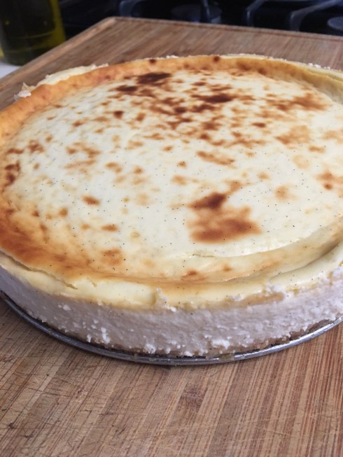 Bake at 325 degrees F for 45-55 minutes. I give mine a little shake to see if the center is overly soft. It’s hard to tell, just do your best. Turn your broiler on and broil the cheesecake just until the top begins to have attractive spots of brown. I think I left mine a few seconds too long for “attractive.” Oh, well.