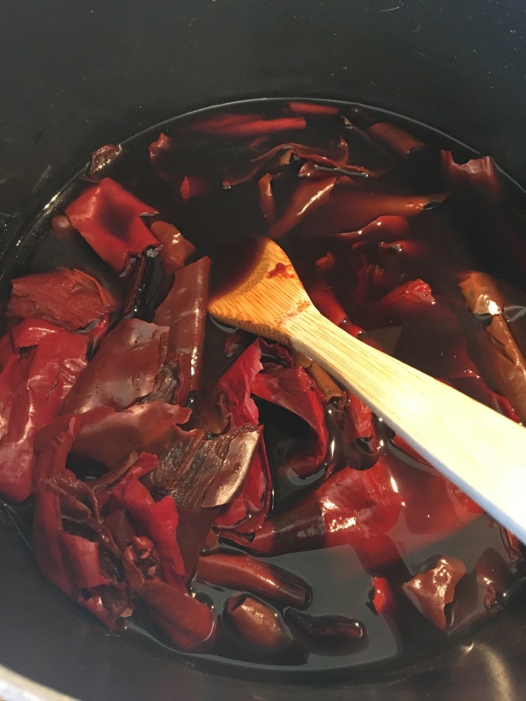 In a very large cooking pot, place the dried chiles and water. Bring to a boil and then let simmer, covered, for thirty minutes. Remove from heat and strain the chiles out of the cooking water. SAVE THE COOKING WATER! Set aside the chiles and the water.