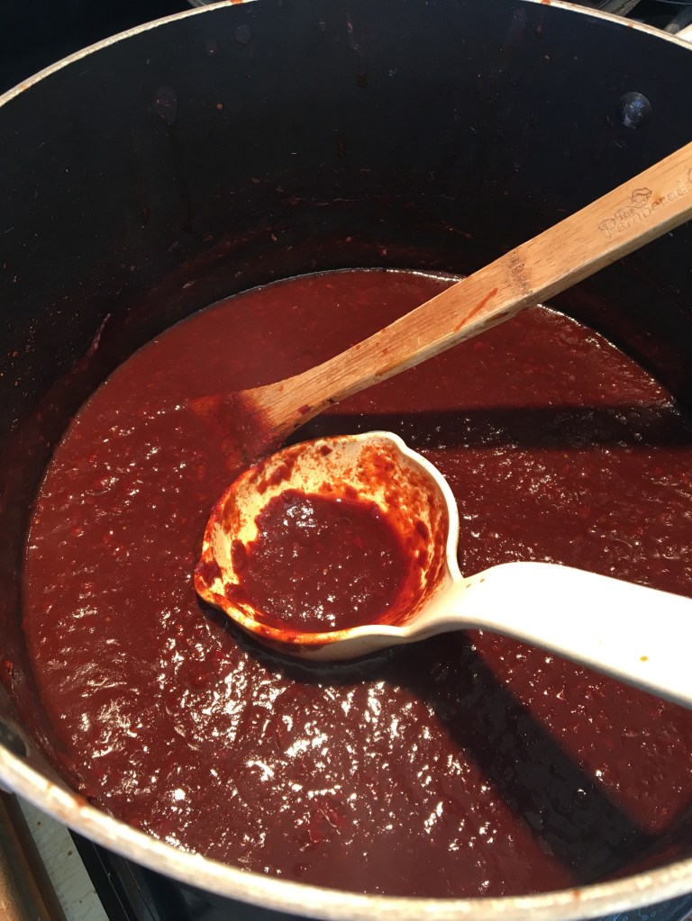 Pour the processed mixture back into the large cooking pot. I rinsed my skillet out with a little chile-water and added that to the cooking pot, too. Bring to a boil and then let simmer, uncovered, for ten or fifteen minutes. Add more chile-water as necessary. Don’t skip the cooking step, it really creates the flavor.