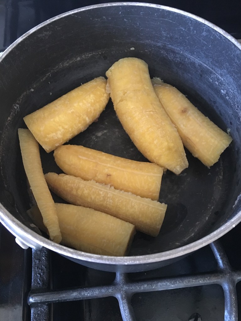 Cut the plantains in half and place into a large saucepan. Try to disabuse yourself of the notion that these are bananas. They’re not. They’re more like potatoes. Add water to cover and add salt. Bring to a boil, reduce heat and let simmer until plantains are soft, about 15 minutes. Remove plantains from water and let cool a little. Mash the plantains. I always end up using a food processor, which works well. I’m not sure if it’s because I’m not cooking them long enough or if they’re old plantains. In any event, mine are always too hard to mash by hand, but the food processor works great.