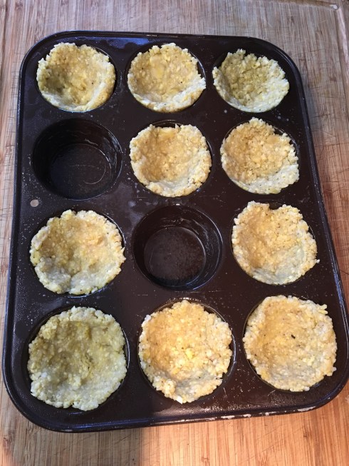 Mashed plantains are sticky, and so it’s easy to form the cups. Grab a handful of mashed plantain and press it into a muffin cup. Make them very compacted. I got 10 plantain cups last time. Brush oil lightly over each cup. I used olive oil, but any type of oil should work.