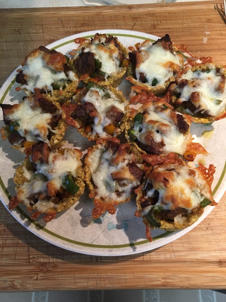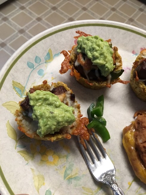 I cut beef Tri-Tip Steak strips into 1″ cubes. I sprinkled taco seasoning over the meat. I preheated a skillet on high heat and added a bit of olive oil. I added the meat to the pan and seared it on all sides as well as possible. I removed the meat from the pan and set it aside. To the skillet I added diced onion, diced sweet mini peppers, and diced garlic. I let it saute until the onion was translucent, then I added some chopped jalapeno peppers. I stirred the beef back into the pan and cooked a bit longer. I scooped a little bit of the filling into each plantain cup, then sprinkled with Monterey Jack cheese. I baked at 425 degrees F for about 10 minutes. I served these topped with mashed avocado, fresh jalapeno slices, and salsa. Umm, umm, good!
