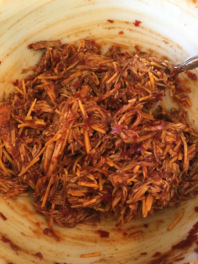 Stir enchilada sauce into the meat and then stir in about 2/3 cup of the shredded cheese. All these quantities are approximate. I eyeballed the amount of shredded pork, sauce, and cheese that I would need. No worries, it’s a forgiving recipe, hard to go wrong.