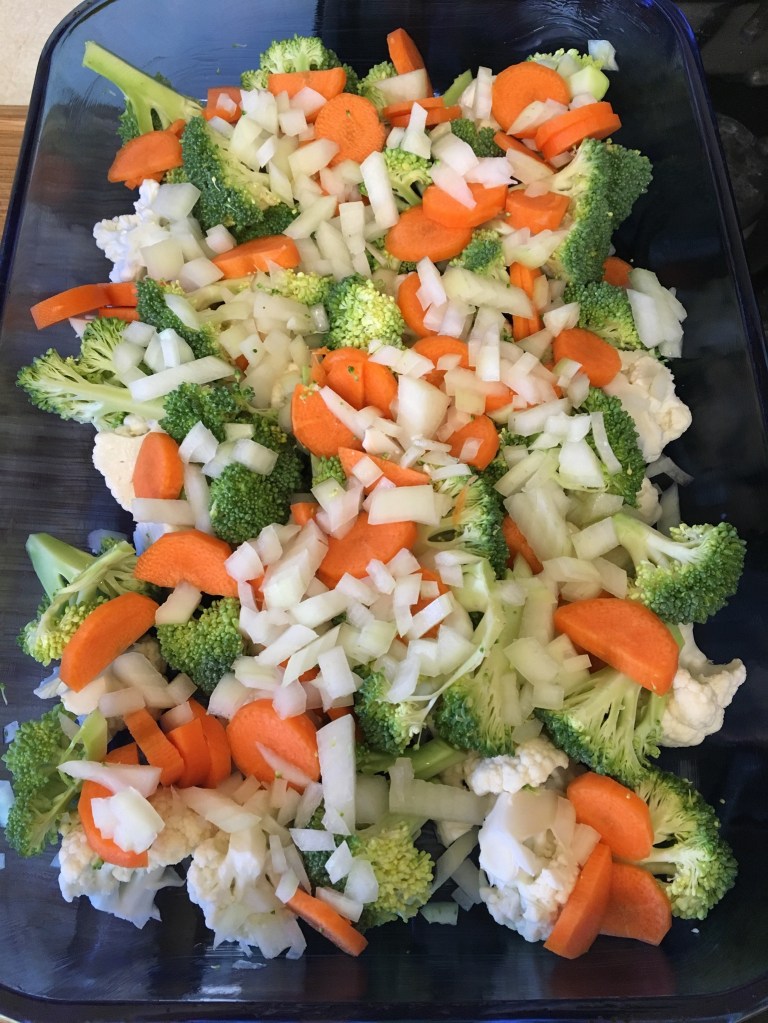Remove the baking dish from the oven and swirl the butter around to try to coat the pan. Sprinkle the vegetables over the butter. I do it in layers in the order given in the ingredient list. Place the vegetables into the 450 degree oven for about 15 minutes.