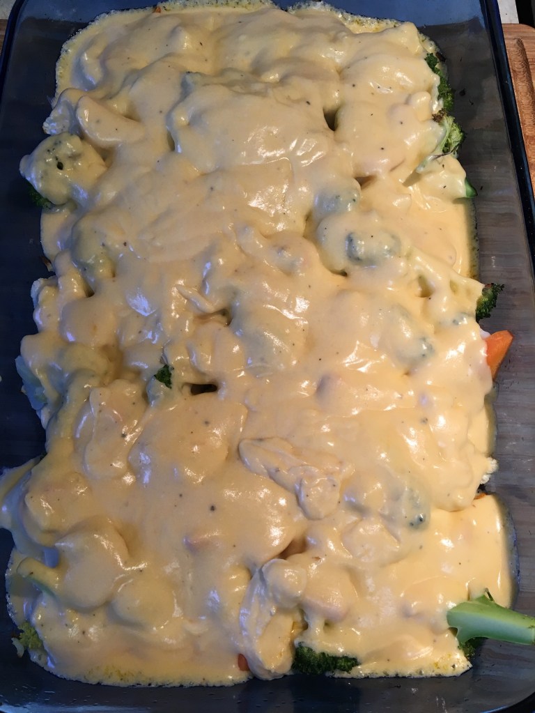 When the vegetables have a slight char across the top, remove from oven. Lower oven temperature to 400 degrees. Pour the cheese sauce over the vegetables. Sprinkle Parmesan evenly over the top of the cheese sauce. Return the pan to the oven and bake at 400 degrees for 25-30 minutes.