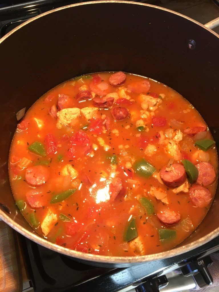 Season the chicken with Cajun or Creole seasoning and salt and pepper. Heat a little bit of oil in a large pot. Add the seasoned chicken and stir fry until the chicken is no longer pink. Stir in the onion, bell pepper, and celery. Continue frying until the onion is translucent and the celery is no longer crisp.