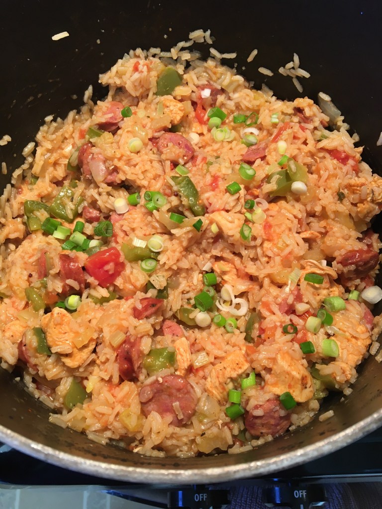 Reduce heat to low, cover the pan, and let simmer 15 minutes without taking off the lid. Remove lid and stir. Take a little bite. If the rice is not nearly done enough, cover and return to very low heat for another 5-8 minutes. If the rice is done, let the pot sit, covered yet unheated, for about 5 minutes. Stir. Sprinkle with green onion. Serve warm now. Serves 4-6 people.