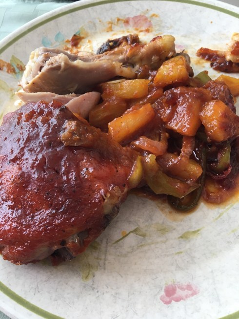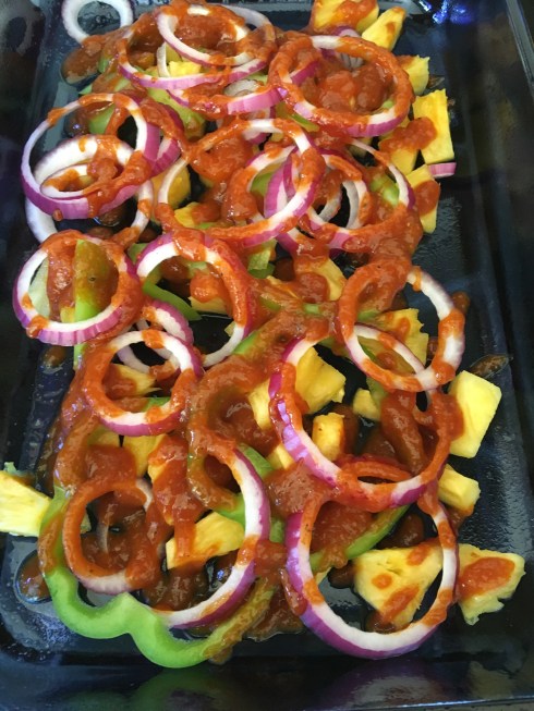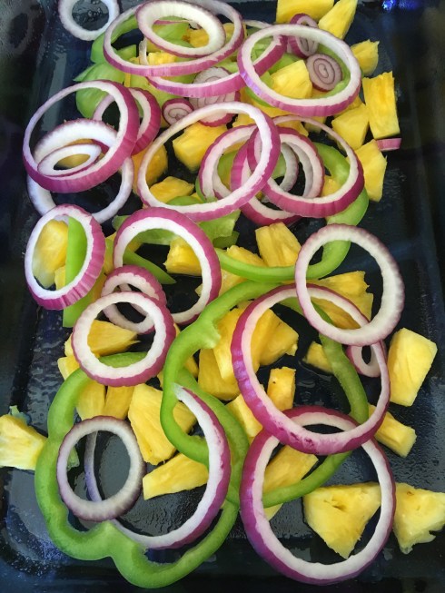 Layer the pineapple, bell pepper, and onion in the baking dish. Sprinkle with 1/2 cup barbecue sauce (SBJ Barbecue Sauce is great for this). Season the chicken with salt and pepper (I used a ground sea-salt garlic combo) and place on top of the barbecue sauce.